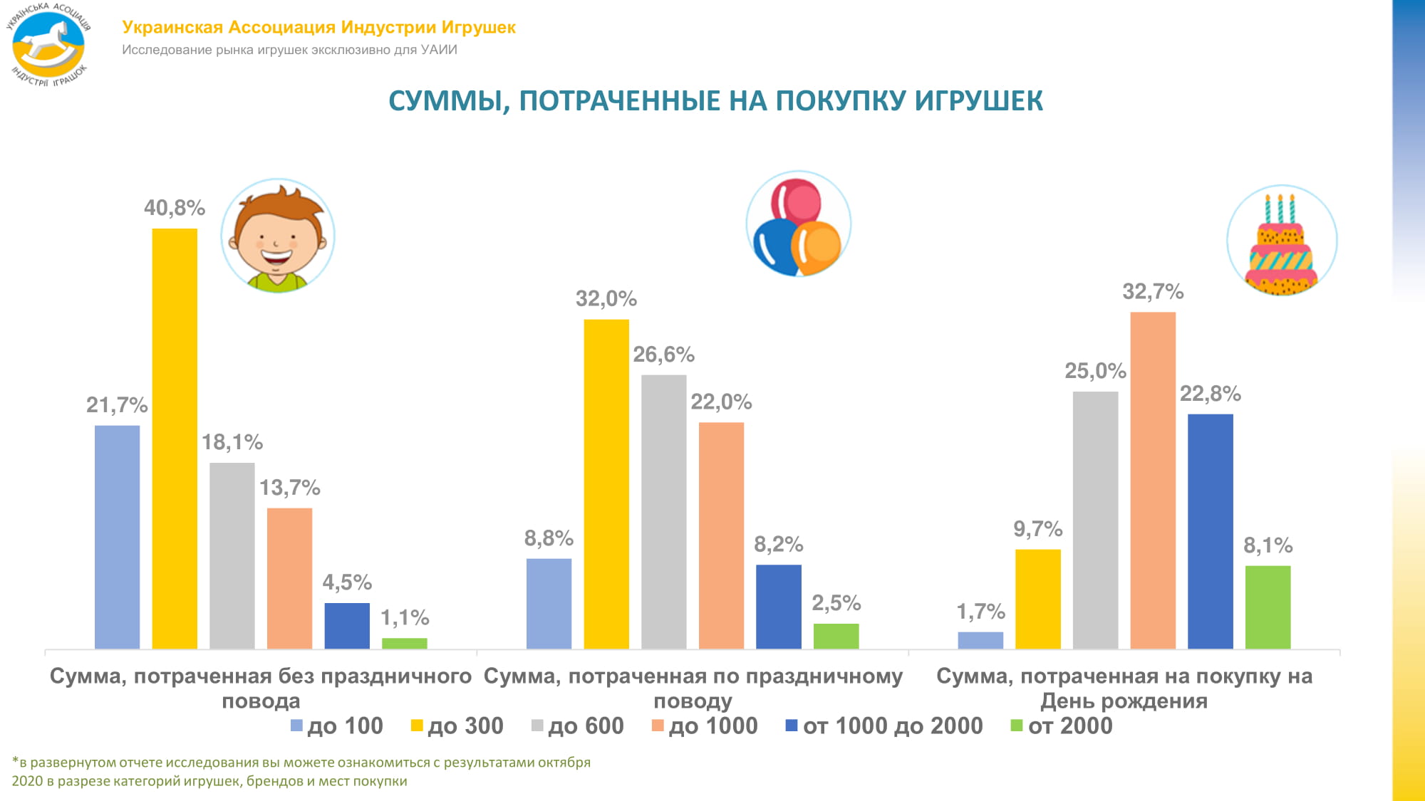 Найбільші суми батьки витрачають на покупку подарунка до Дня народження дитини. У 2020 році 32,7% респондентів готові витрачати на його покупку від 1000 грн і більше. Купівля іграшки дешевше 600 грн продовжує втрачати вагу. Загалом іграшки купують 66,9% респондентів, що на 2,4% менше, ніж роком раніше. Гроші і гаджети в якості подарунка на День народження також трохи здали позиції. Збільшують свою частку розваги і дитячий транспорт (скутери, самокати, електро-самокати та інше). Смартфони та планшети впали на 3%, що можна пов’язати з тим, що у дітей від трьох років вже зазвичай є гаджети, іноді по кілька.