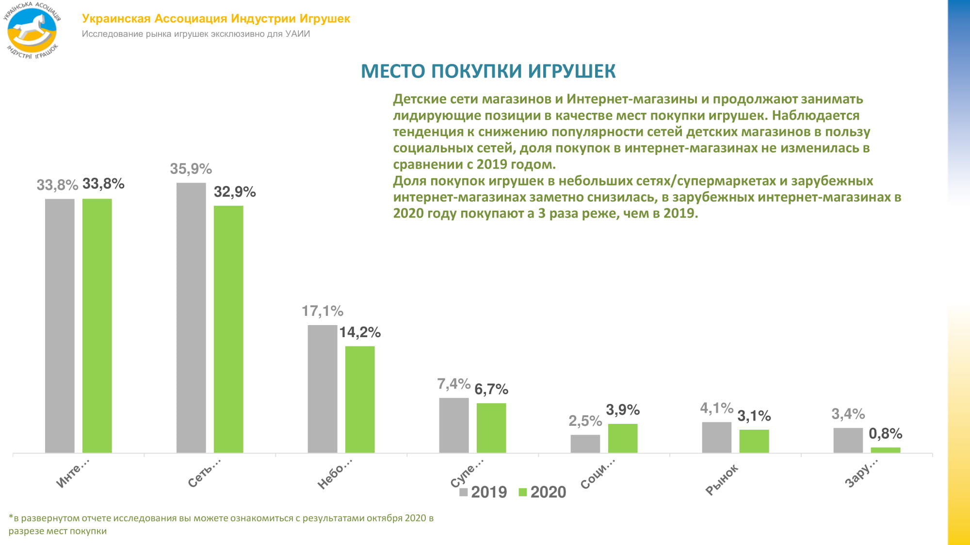 Значно впала частка покупок на зарубіжних сайтах. У 2020 році на них купують в три рази рідше, ніж в 2019-му. Також знижується інтерес покупців до покупок іграшок в невеликих мережах, супермаркетах і на ринках.