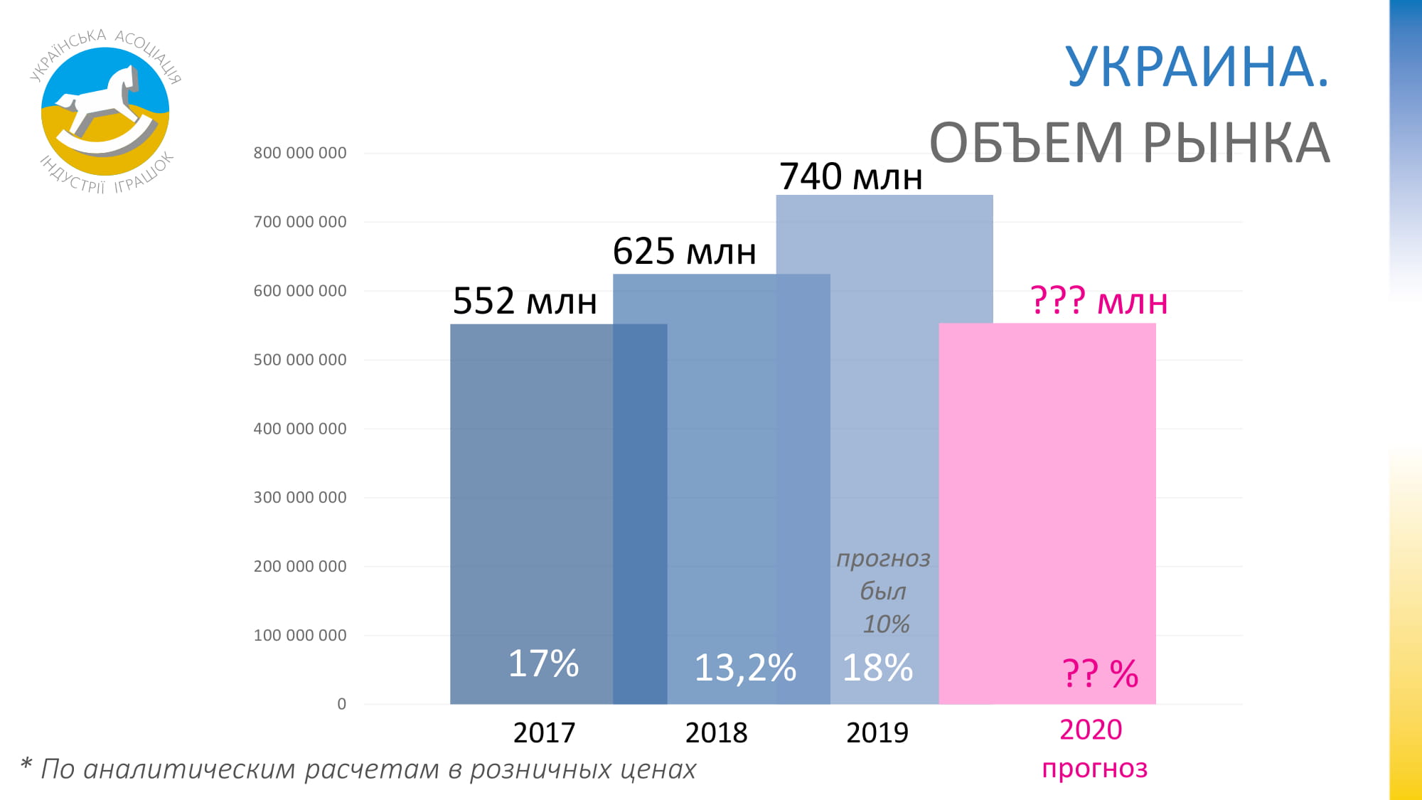 Згідно з даними членів УАІІ, за минулий 2019 рік обсяг ринку іграшок України в роздрібних цінах збільшився на 18%, досягнувши $740 млн. Зростання тривало всі останні три роки. Про поточний 2020-й все ще важко що-небудь прогнозувати, падіння може варіюватися в межах 10-25%.