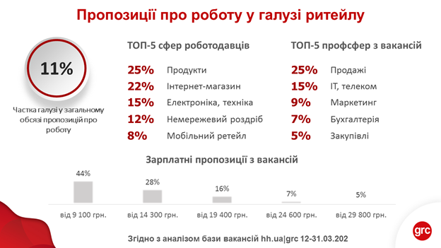 За інформацією Head Hunter, найчастіше компанії галузі роздрібної торгівлі протягом другої половини березня шукали фахівців сфери продажів (продавців в магазин, менеджерів по роботі з клієнтами тощо). Крім того, досить активно вони пропонували роботу розробникам ПО (15% всіх вакансій), маркетологам (9% всіх вакансій) і бухгалтерам (7% всіх вакансій).