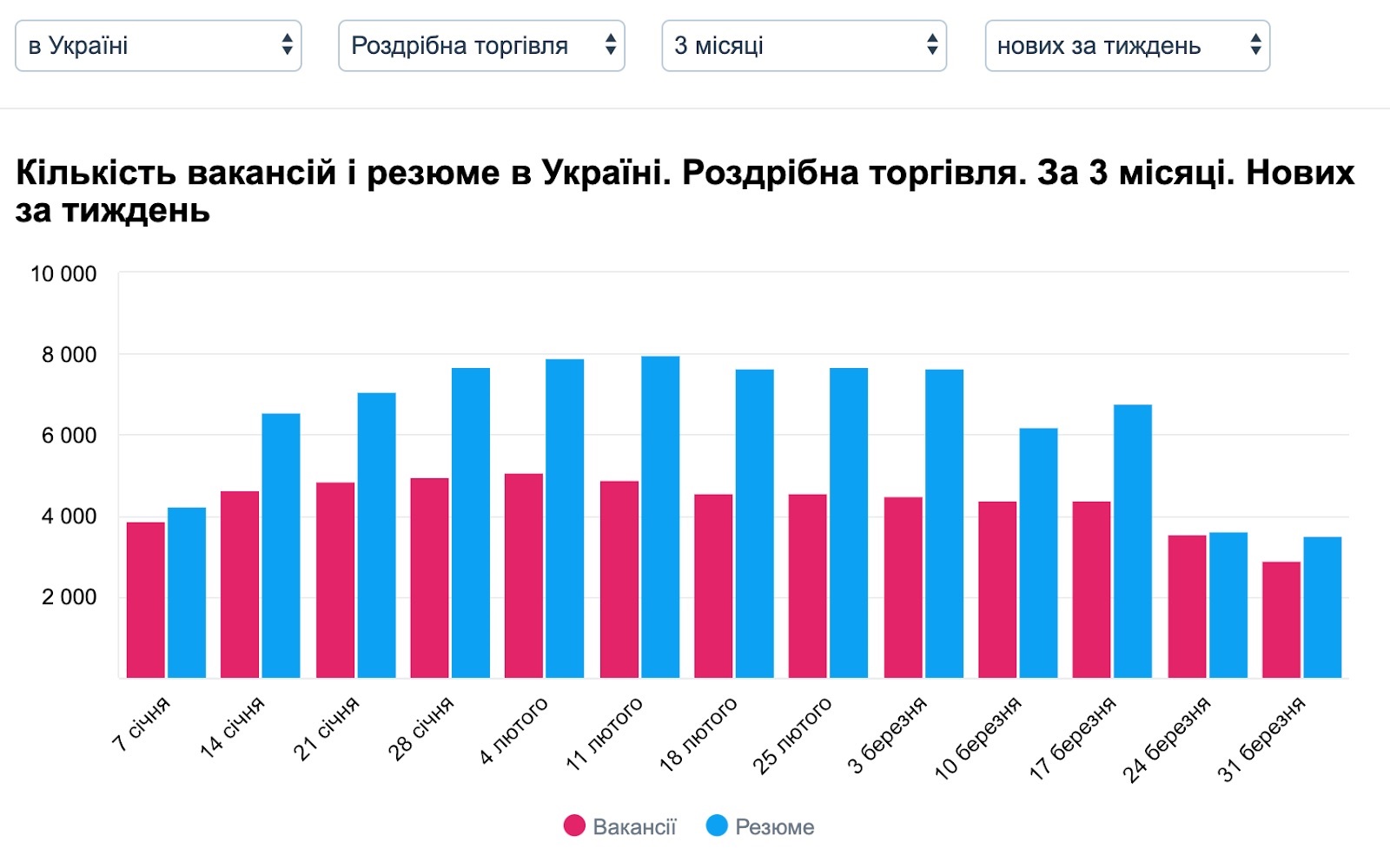 У другій половині березня (12-31 числа) найбільше пропозицій про роботу в сфері роздрібної торгівлі розмістили продуктові роздрібні мережі – на них припадає 25% всіх вакансій в цій галузі.