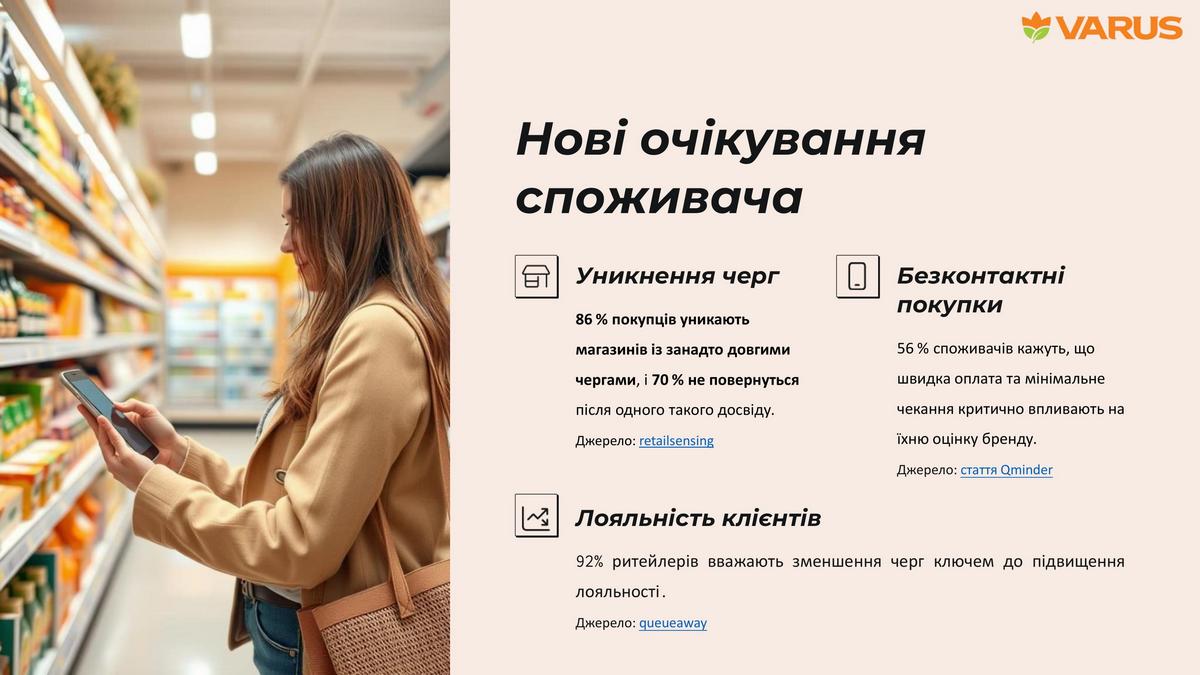 Сучасний ритейл вимагає нових рішень, щоб відповідати очікуванням споживачів. Критична проблема сучасного ритейлу — це черги. Так, 86% покупців уникають магазинів із довгими чергами, а 70% не повертаються після одного негативного досвіду очікування. Це не просто незручність для клієнтів — це серйозні фінансові втрати для бізнесу.