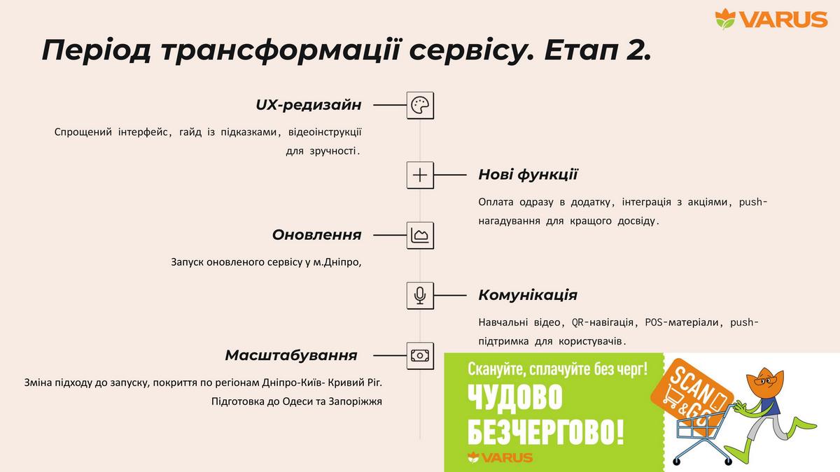 Розуміючи проблему черг, мережа Varus запустила пілотний проєкт Scan&Go у жовтні 2022 року в п’яти магазинах у Дніпрі. Технологія дозволяє покупцям сканувати товари власним смартфоном під час пересування торговим залом та оплачувати покупки на касах самообслуговування, повністю минаючи традиційні черги. Що окрім підвищення зручності покупок допомагає зменшити кількість касирів – важливий аргумент в умовах дефіциту кадрів. Але перед впровадженням потрібно було спочатку провести аналіз ринку та готовності споживачів користуватися новим сервісом. Тому після вивчення досвіду інших ритейлерів було створено прототип та проведено його внутрішнє тестування. І тільки потім – тестування сервісу з найбільш «просунутими» клієнтами Varus. Таких набрали рівно 1000 осіб, що були максимально активними по цифровій карті лояльності в додатку ритейлера.