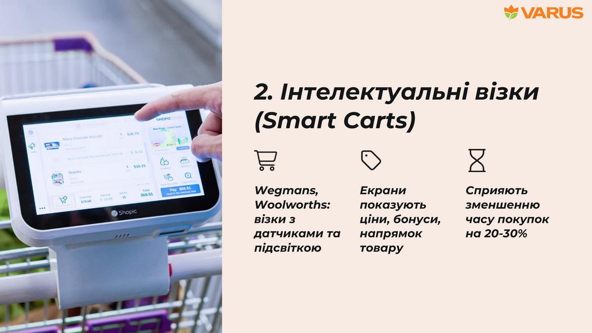 Ще одним різновидом цієї системи є інтелектуальні візки (Smart Carts, що використовуються замість смартфонів для сканування товарів). Як показав досвід ритейлерів Wegmans та Woolworths, така система може скоротити час покупок на 20-30%.