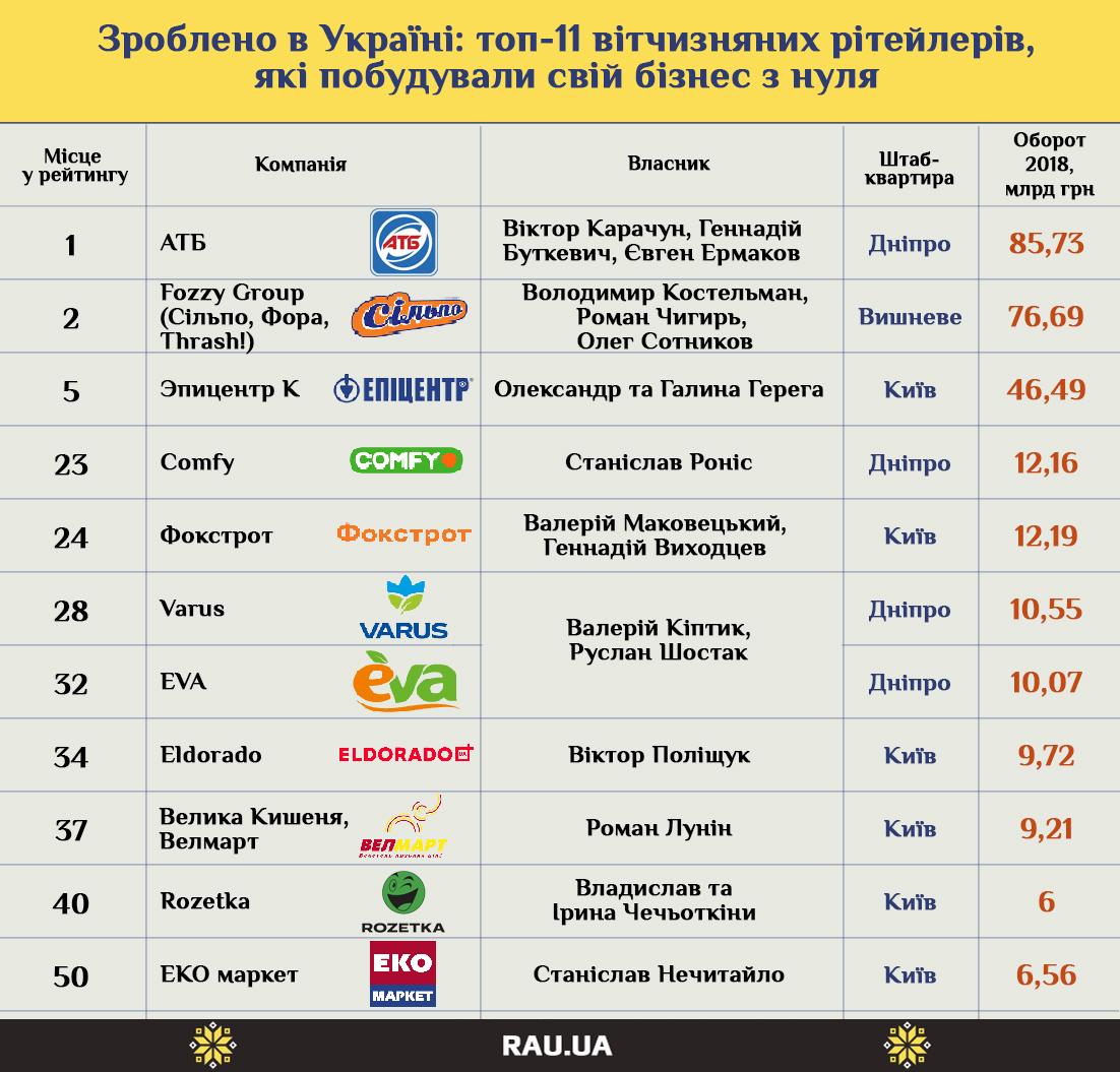 Якщо ж говорити про рітейлерів з виключно або переважно українським капіталом, в топ-5 рейтингу Liga потрапили відразу три компанії сфери роздрібної торгівлі: АТБ, Fozzy Group, Епіцентр. Втім, вони фігурують практично у будь-яких списках і бізнес-рейтингах, і, як правило, займають там лідируючі позиції, а їх власники регулярно потрапляють у топ-100 найбагатших людей України. І теж не на останніх місцях.