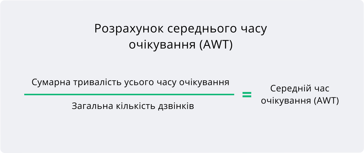 Середній час очікування, або AWT (Awerage Waiting Time) — це час, який клієнти зазвичай чекають на лінії до з’єднання з оператором. Подібний показник часто входить до KPI не тільки кол-центру, але й служби підтримки, в телекомунікаційних компаніях, фінансових та державних установах. Тобто всюди, де відсутність миттєвої реакції може мати серйозні наслідки для клієнта.