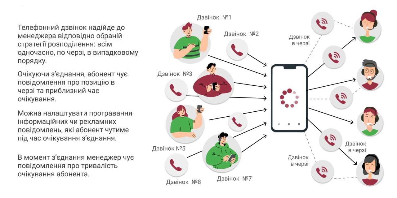 Черга дзвінків — це функціонал, який дозволяє утримувати клієнтів на лінії та не втрачати їх навіть в час великого навантаження на кол-центр.