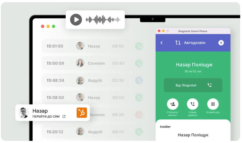 - Використовуйте рішення, які одразу показують інформацію про покупця. Вони інтегруються з CRM та можуть підтягувати звідти дані про замовника. Наприклад, оператор одразу зможе звернутися до покупця на ім’я, а не питати про це. Є рішення, які також дозволяють перейти з екрану дзвінка одразу в картку покупця в CRM або угоду. Так оператор зможе одразу побачити нюанси замовлення, а не просити клієнта їх нагадати.