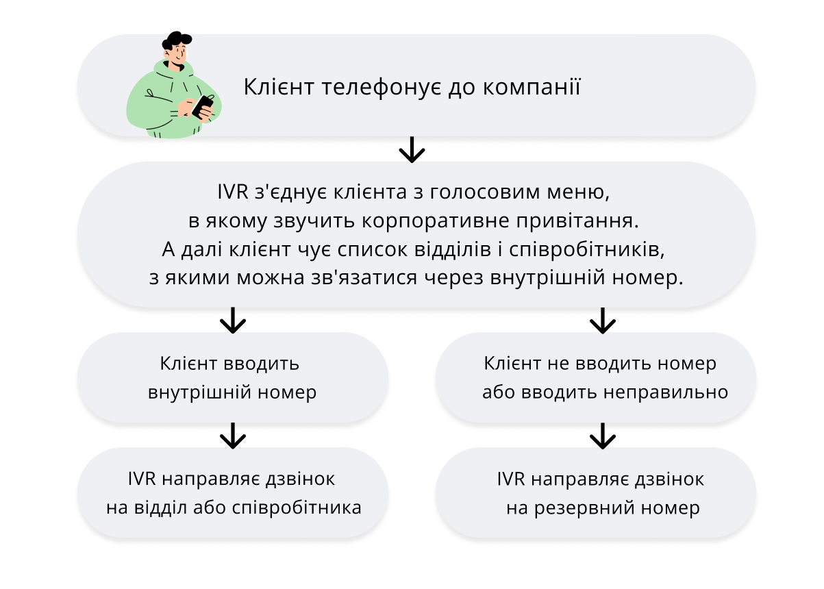 Залежно від того, що обере клієнт, виклик буде спрямовано на відповідального оператора або їх групу. А кожна частина команди працюватиме тільки зі своїм сегментом покупців, не відволікаючись на інші запити. Ба більше — для простих питань можна надавати автоматичну відповідь без залучення людини. Наприклад, покупець може ввести номер замовлення, а автовідповідач озвучить його статус.