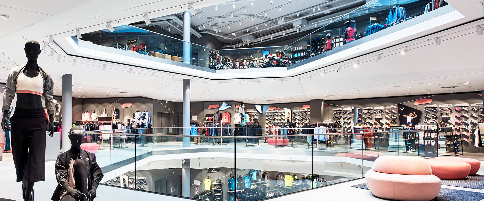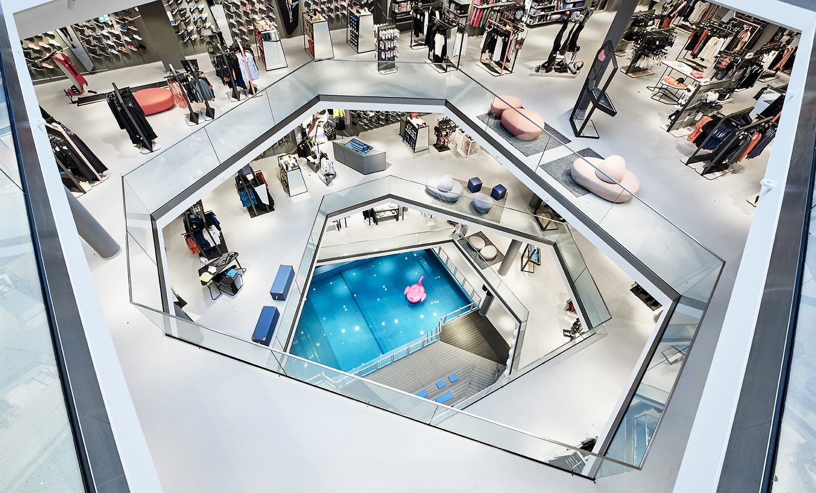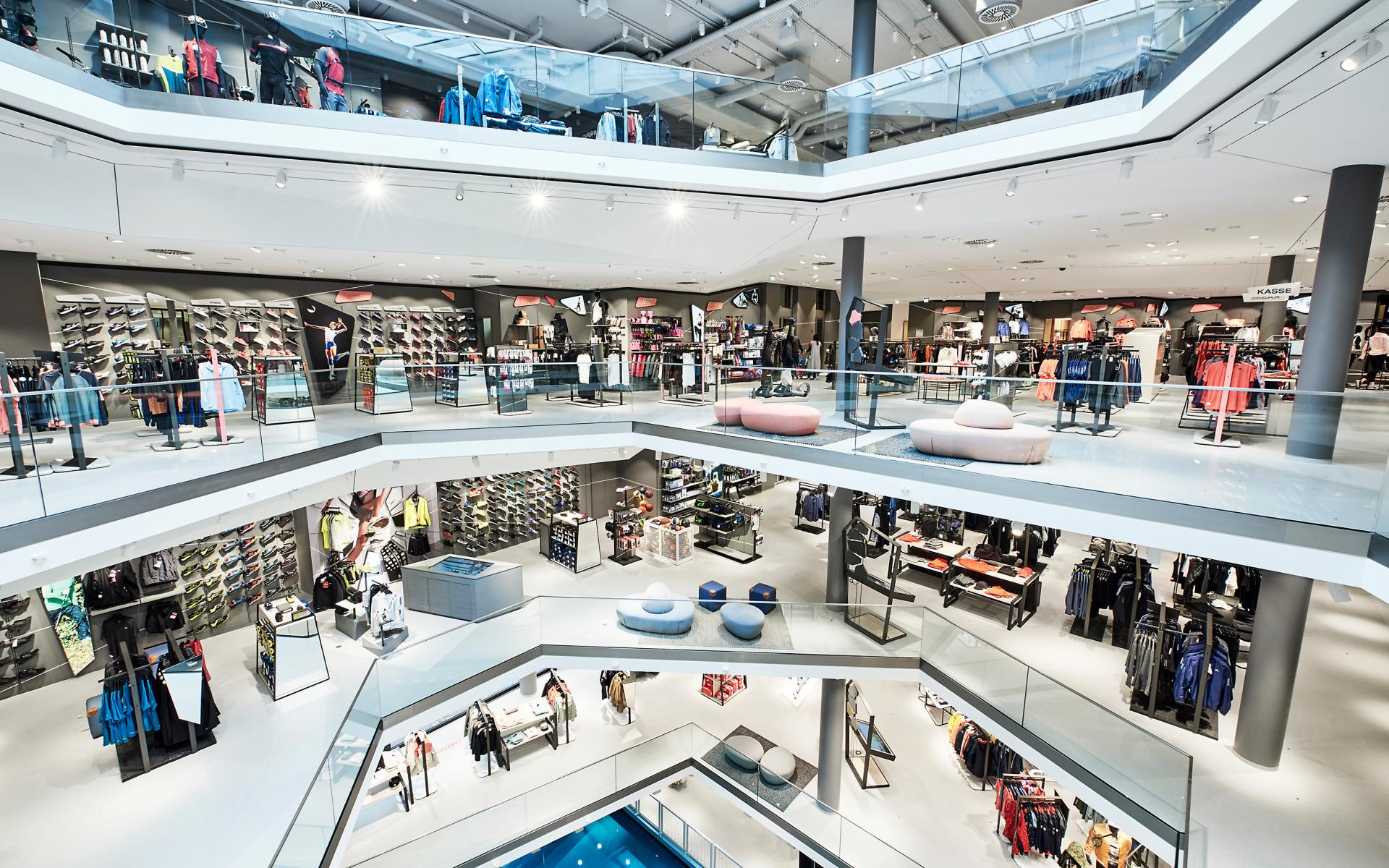 Навколо атріуму з видом на басейн за тематичним принципом розташовані секції спорттоварів, одягу і взуття. Так, на першому поверсі покупці можуть знайти все для відпочинку на морі та пляжі, включаючи дошки для серфінгу, а також екіпірування для зимових видів спорту – лижі, ковзани, сноуборди і т.д.