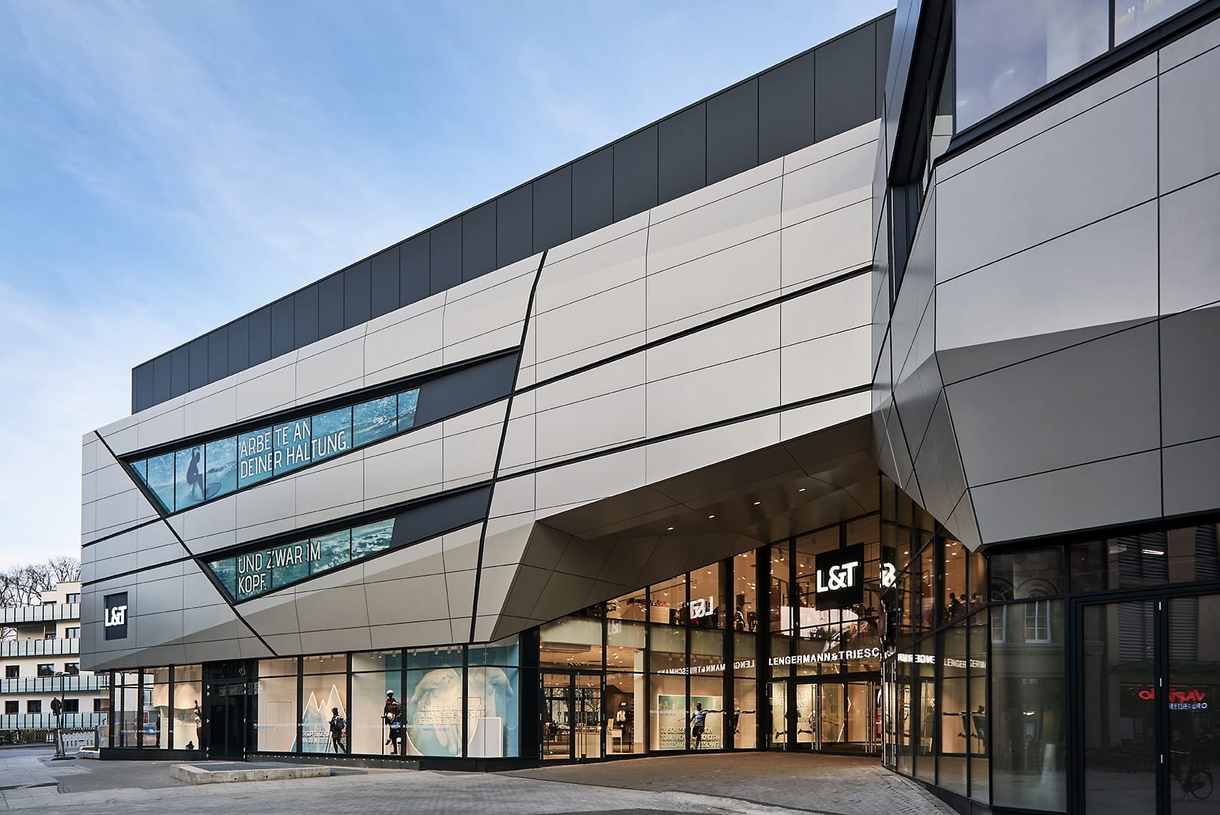 Будівля L&T Sporthaus виконано в футуристичному стилі. З висоти пташиного польоту універмаг нагадує спортивний комплекс, і тільки вітрини першого поверху видають в ньому магазин. Будівництво торгового центру площею 5500 кв. м зайняло два роки і коштувало рітейлеру 35 млн євро.