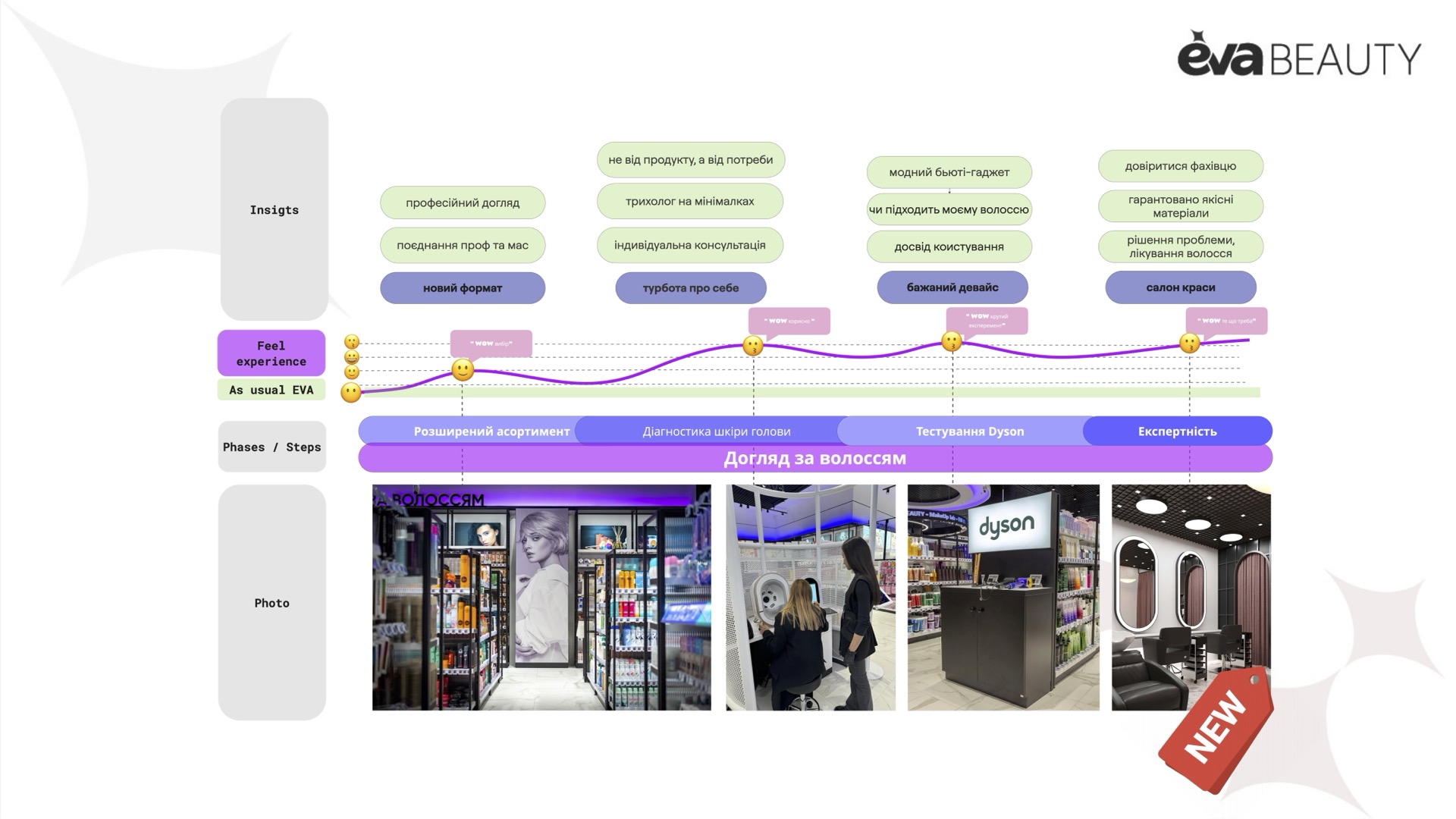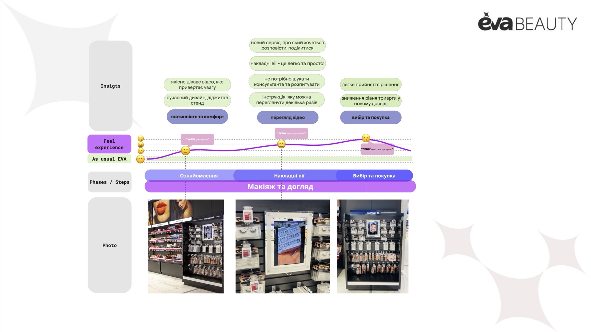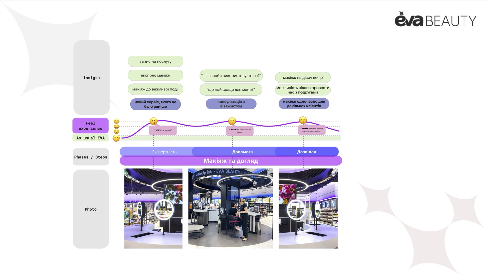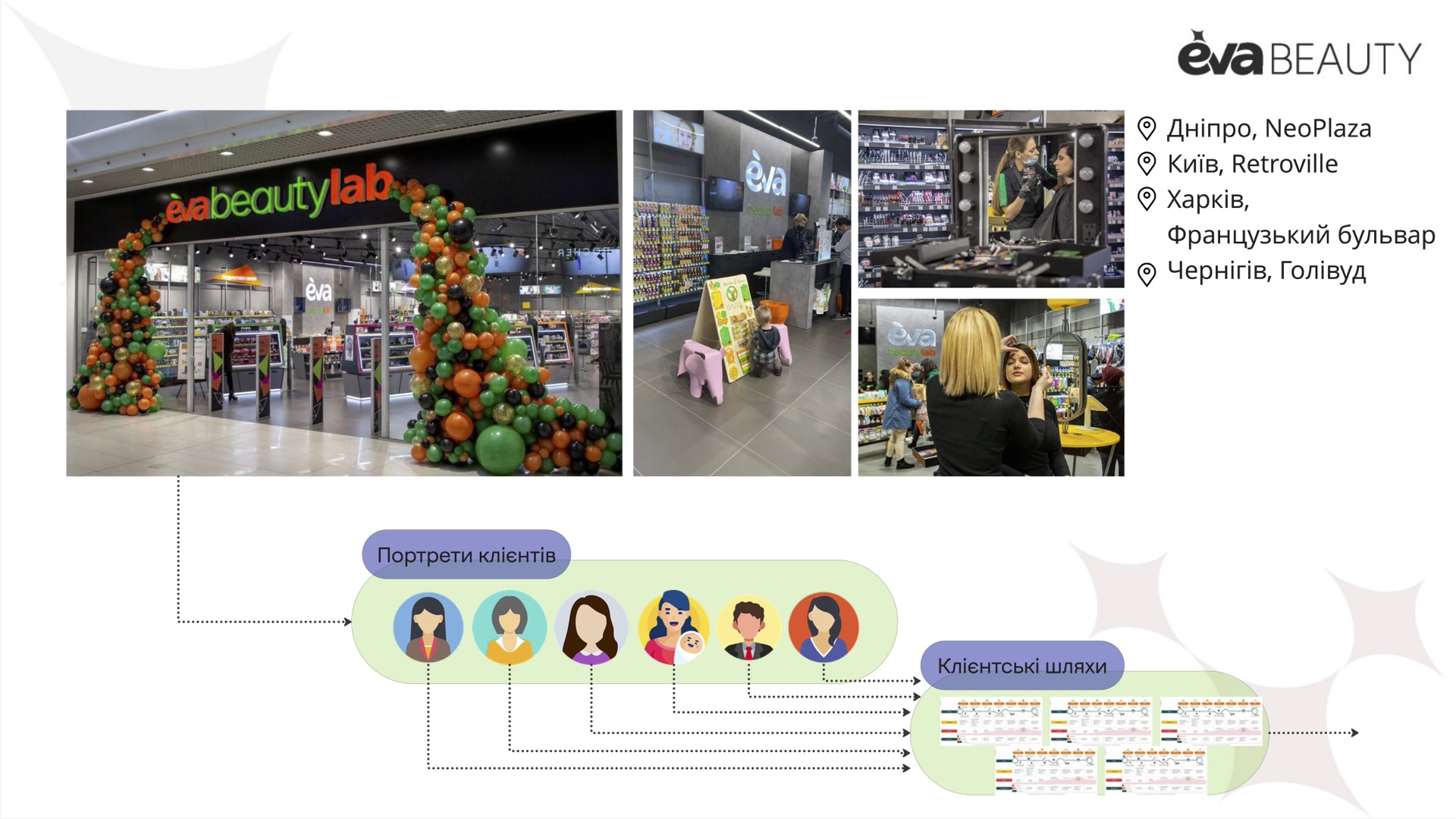 У 2019 році мережа відкрила перший магазин у форматі Eva Beauty Lab. Це сервісний магазин, в якому можна було отримати послуги діагностики шкіри, візажу тощо. Згодом подібні магазини з’явились у Києві, Харкові, Чернігові, та стали майданчиком для експериментів та досліджень. Саме в цих магазинах ми досліджували свою аудиторію, і неочікувано виявили нові портрети клієнтів. Ми також з’ясували, що наші клієнти мають потребу у преміальному сервісі та готові купувати дорогі продукти. Саме тому ми розпочали розробку нового формату.
