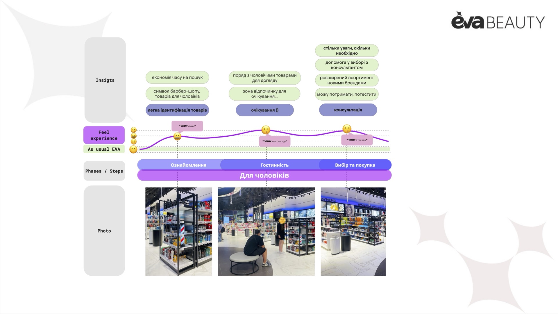 Особливу увагу ми приділили зоні з чоловічими засобами. Перш за все, у цій зоні розташовані пуфи для очікування, на яких можна зручно сидіти, поки дружина чи дівчина робить шопінг. І стелаж із товарами для чоловіків розташований якраз навпроти цих пуфів. Ми вже спостерігали на практиці, як чоловіки після певного часу очікування та гортання стрічки в телефоні звертають увагу на цей стелаж і виходять з магазину з покупками для себе.