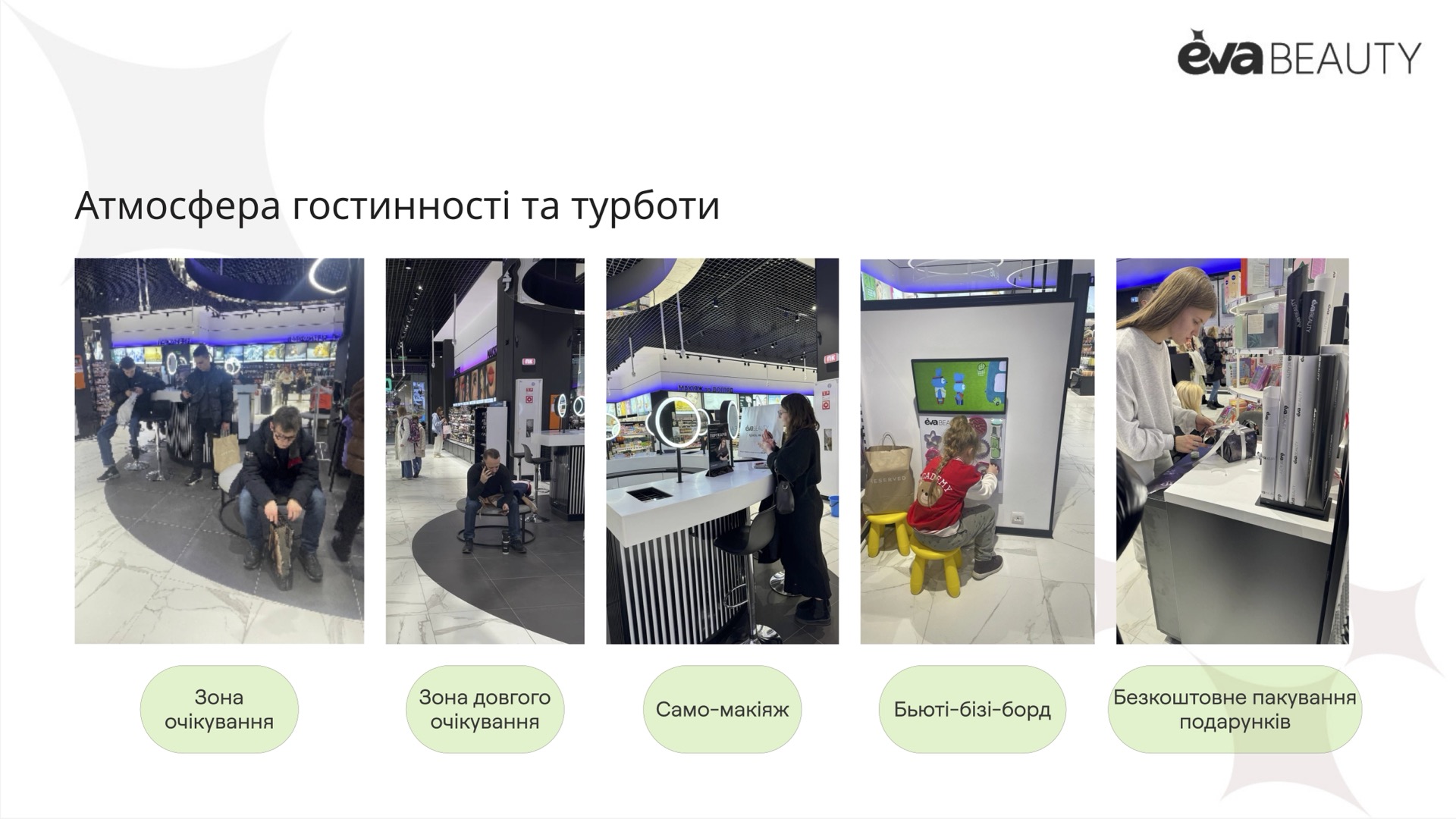 Оскільки Eva Beauty – це сервісний магазин, тож ми передбачили кілька цікавих сервісів для наших жінок. По-перше, в магазині є б’юті зона, де можна зробити експрес чи повноцінний макіяж. По-друге, наші консультанти можуть допомогти підібрати клієнтці саме ту червону помаду, бронзатор чи консилер, і одразу ж проконсультувати щодо того як саме цією косметикою користуватись. І, по-третє, у нас є те, чого в Україні ще ніхто не робив. Це зона дозвілля, де можна проводити дівочі вечори. Тепер подруги можуть забронювати в нас на певний час це місце, де професійний візажист навчить їх робити макіяж, з яким вони можуть далі вирушити в бар чи ресторан.