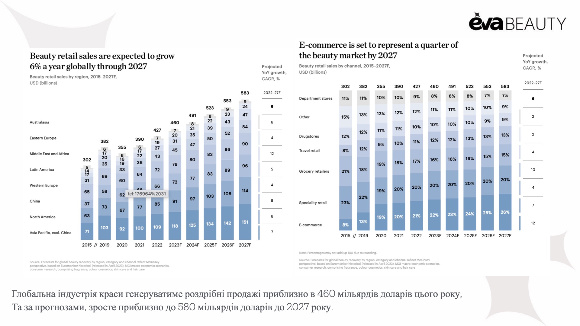 Зараз глобальна індустрія краси складає приблизно $460 млрд. Ринок продовжує зростати, і за прогнозами McKinsey&Company він вже становитиме $570 млрд. Загалом щорічно ринок краси зростає приблизно на 6%.