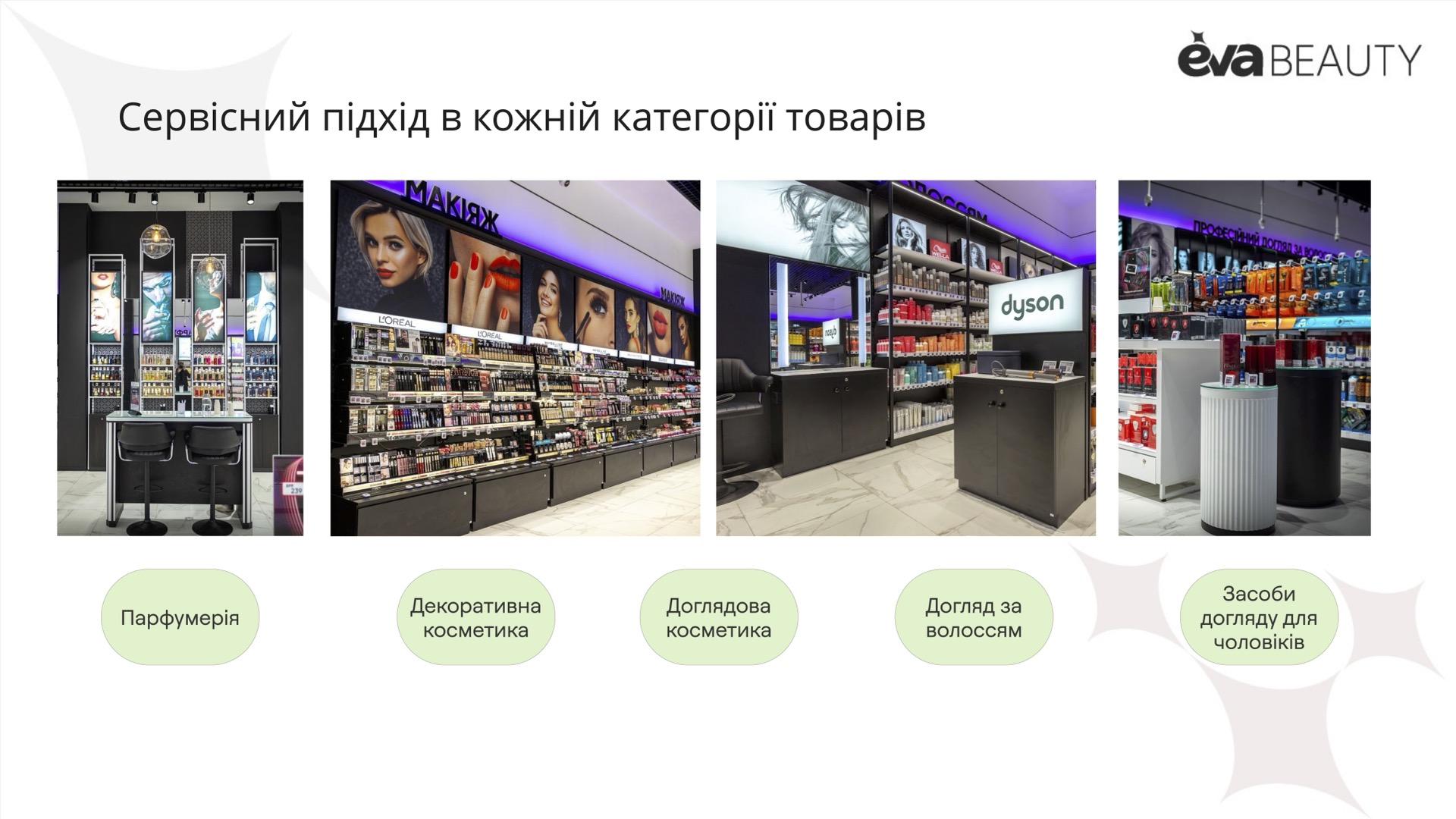 На прикладі Eva Beauty Lab ми переконались, що в сервісному магазині мають бути такі основні категорії як парфумерія, декоративна косметика, догляд за волоссям, догляд за шкірою обличчя, догляд за тілом та чоловічий догляд. У кожній з цих категорій ми створили окремий клієнтський шлях та продумали корисні сервіси, якими із задоволенням будуть користуватись наші відвідувачі.