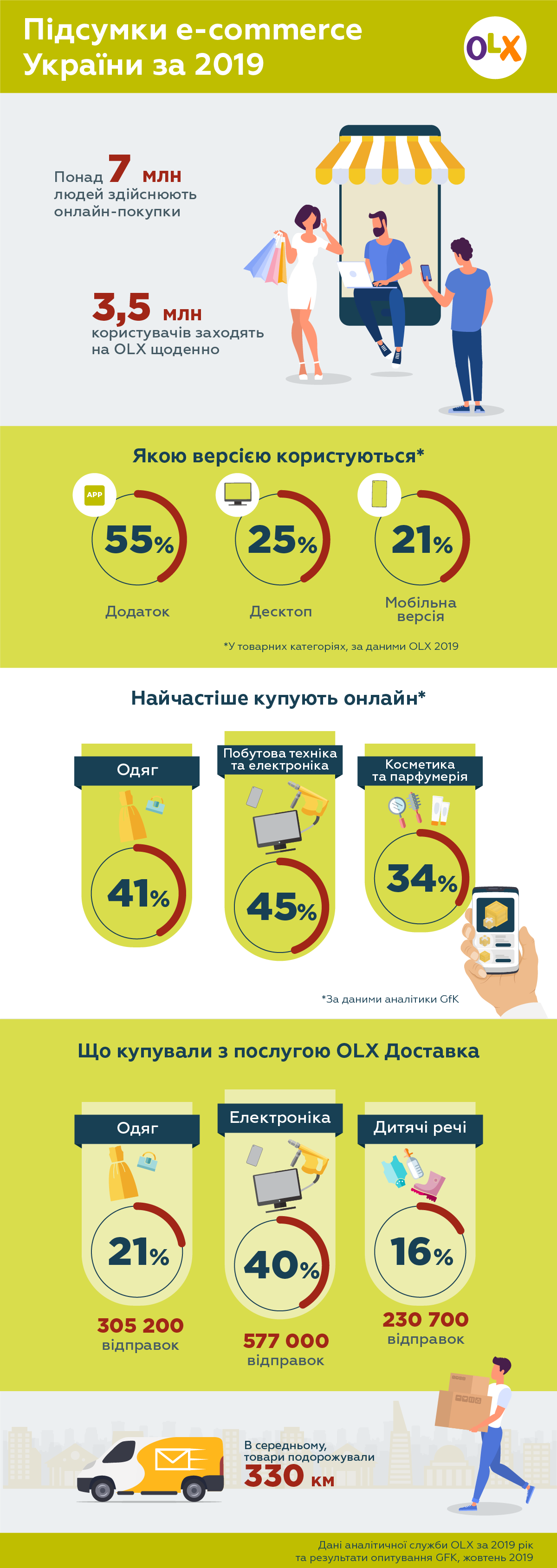 Серед товарів, які найчастіше купують онлайн, лідерами залишаються побутова техніка та електроніка. За даними GfK за жовтень 2019-го, дані товари купують 45% українських інтернет-споживачів. При цьому в більшості випадків замовляють дрібну техніку для будинку (міксери, фени, праски), смартфони, планшети та інші гаджети. Дані OLX підтверджують тенденцію: оголошення в категорії електроніки отримали найбільше відгуків за рік – понад 34,5 млн. При цьому на кожну пропозицію відповідали в середньому 3,6 раза, а середня сума покупки в останні три місяці року склала 2190 грн.