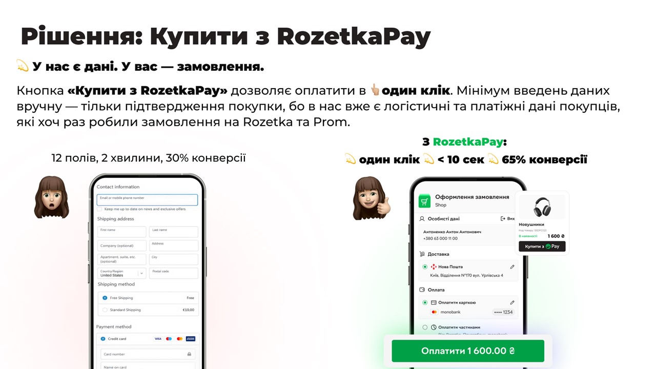 Тож RozetkaPay зробили рішення, яке покращить клієнтський досвід та дозволяє оформити замовлення в кілька кліків. За експертними оцінками спрощений спосіб оформлення замовлення підвищує конверсію до 30% і зменшує кількість покинутих кошиків.