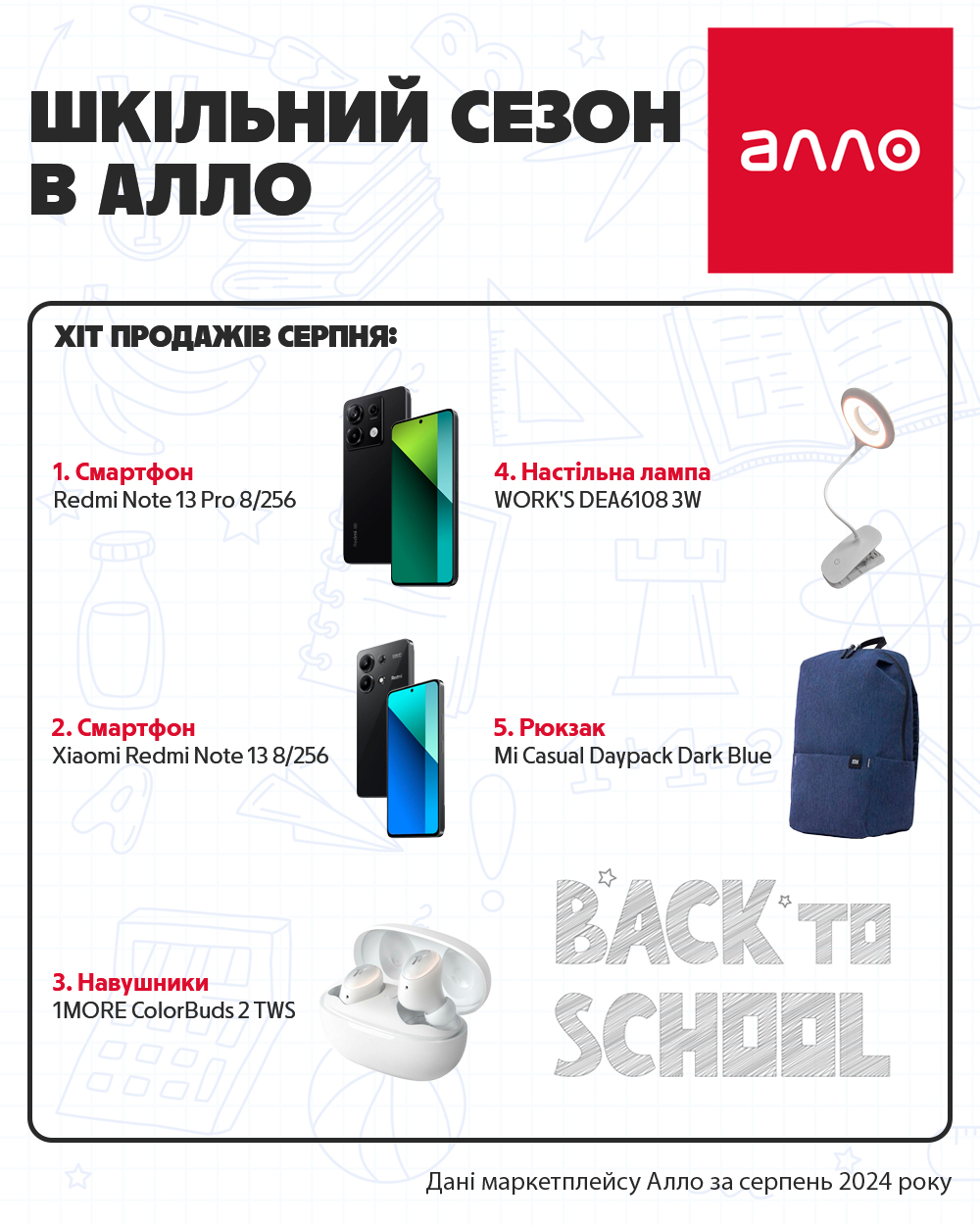 До навчального року маркетплейс інноваційних товарів Алло запропонував знижки до 50% на потрібні для навчання товари, щоб підготовка до навчального року була легкою та вигідною. До переліку найбільш затребуваних товарів для школи та навчання потрапили рюкзаки, смартфони, ноутбуки, бездротові навушники, LED-лампи, планшети та павербанки.