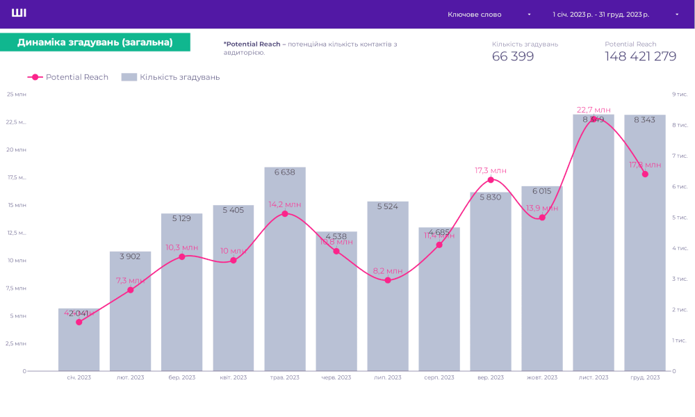 Протягом року тема штучного інтелекту поступово набирала поширення. Якщо у лютому майже 4000 згадок зумовлені тим, що ChatGPT став доступним в Україні, то в листопаді та грудні понад 8000 згадок щомісяця стосувалися і загально-політичних тем. З огляду на те, що більшість держав почали вирішувати правові та морально-етичні питання щодо ШІ, це не могло не відобразитися на українському інфо просторі.