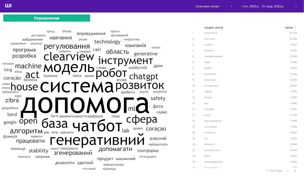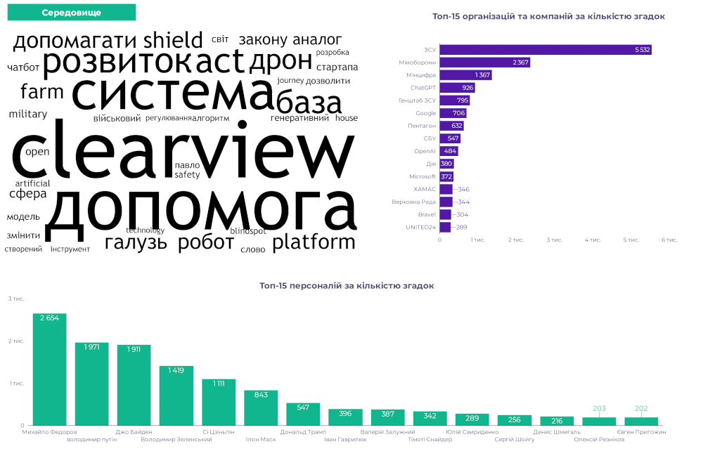 Якщо говорити про контекст і середовище, в якому трапляються згадки, то найчастіші слова – це допомога, система, чатбот, генеративний (вид ШІ) – тобто ті слова, які стосуються перш за все використання штучного інтелекту. Цікаво, що в середовищі згадок про ШІ, достатньо часто трапляється Clearview. Це американська компанія з розпізнавання облич, яка надає програмне забезпечення для правоохоронних та державних органів. Окрім того, Clearview допомагає українським спецслужбам, а представники техностартапу декларують зацікавленість відкрити представництво в нашій державі.