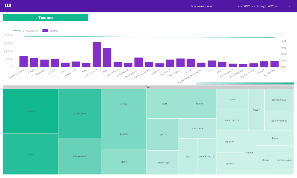 Натомість в трендах згадок ШІ переважають слова, які стосуються більш конкретних сфер. Наприклад, дуже виділяється військова тематика: слова військовий, дрон, виробництво увійшли в 10 найбільш згадуваних.