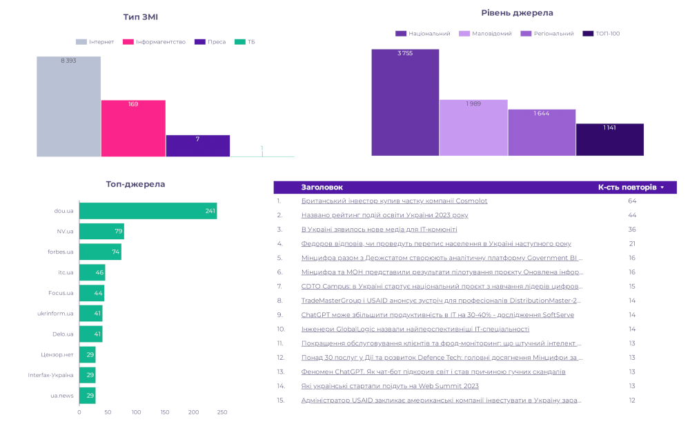 Більш ніж половина публікацій була у виданнях рівня ТОП-100 та національного рівня. Загалом же в 2023 році потенційне охоплення новин про штучний інтелект в українському сегменті склало понад 148 мільйонів.
