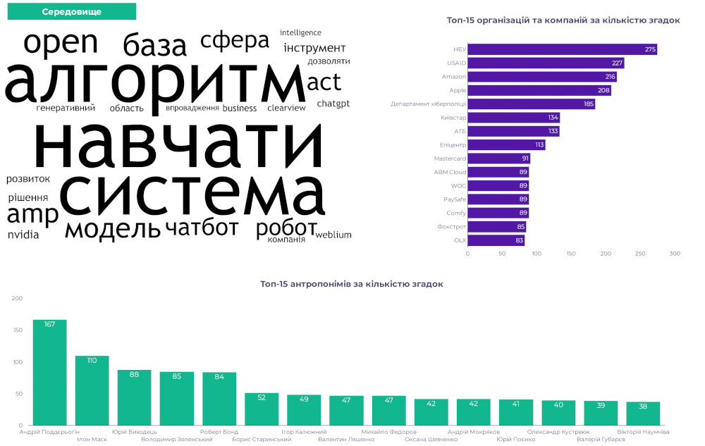 Серед згадуваних організацій переважали компанії та соцмережі, які експериментують з впровадженням штучного інтелекту: ChatGPT, Google, OpenAI, Facebook, YouTube, TikTok, Instagram, Twitter, LinkedIn. Найчастіше в новинах цієї теми штучний інтелект стояв поруч із словами генеративний, чатбот, робот, згенерувати.