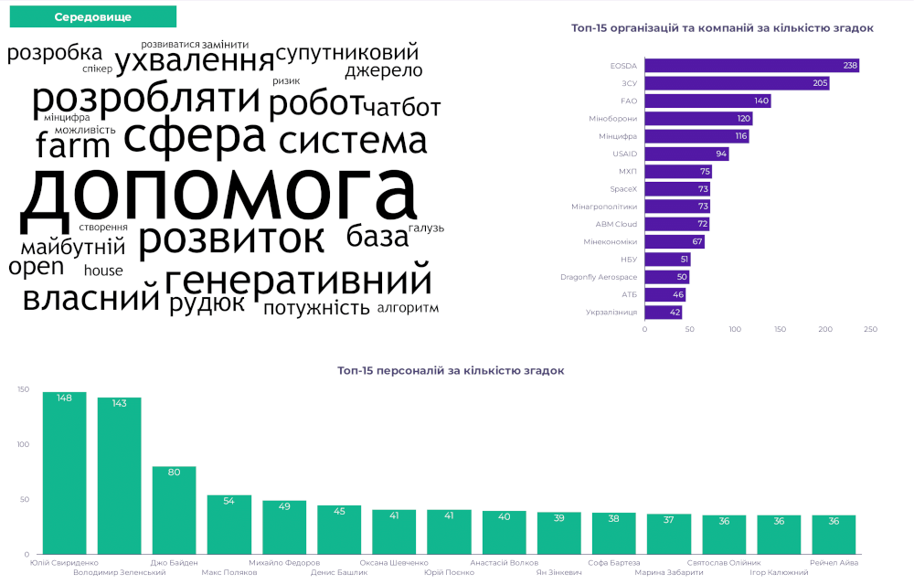 Найбільше писали про компанію EOS Data Analytics, Збройні Сили України та FAO (продовольча та сільськогосподарська організація ООН). Цікаво, що до найбільш згадуваних персоналій увійшли дві українки, яких журнал Time вніс до рейтингу Time 100 Next – міністерка економіки Юлія Свириденко й інноваторка, засновниця агростартапу Flurosat Анастасія Волкова.