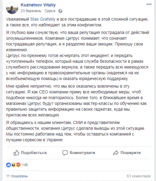 Зрештою, телефон виявився робочим, і співробітник Цитрус перепродав його на ринку в Дніпрі. Новий власник телефону знайшов в ньому інтимні фото дівчини і почав її шантажувати, а її брат Стас Графський написав про це в Facebook (сьогодні публікація видалена). За добу понад тисячу осіб поділилися цим записом.