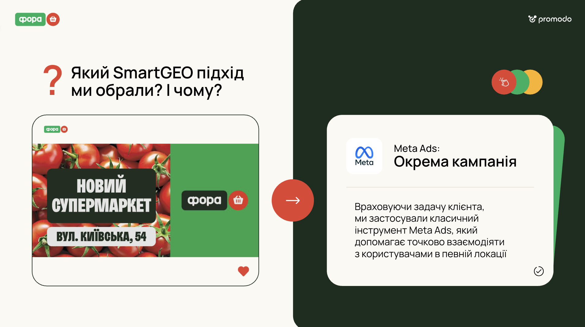 Для вирішення поставлених завдань було обрано підхід SmartGEO у медійному просуванні. Суть цього методу полягає у створенні максимального медійного тиску за допомогою інструментів, що дозволяють здійснювати локальний таргетинг у межах певного радіусу.