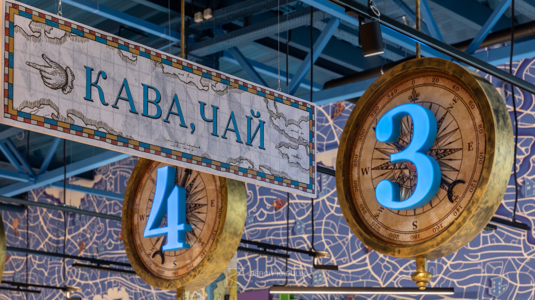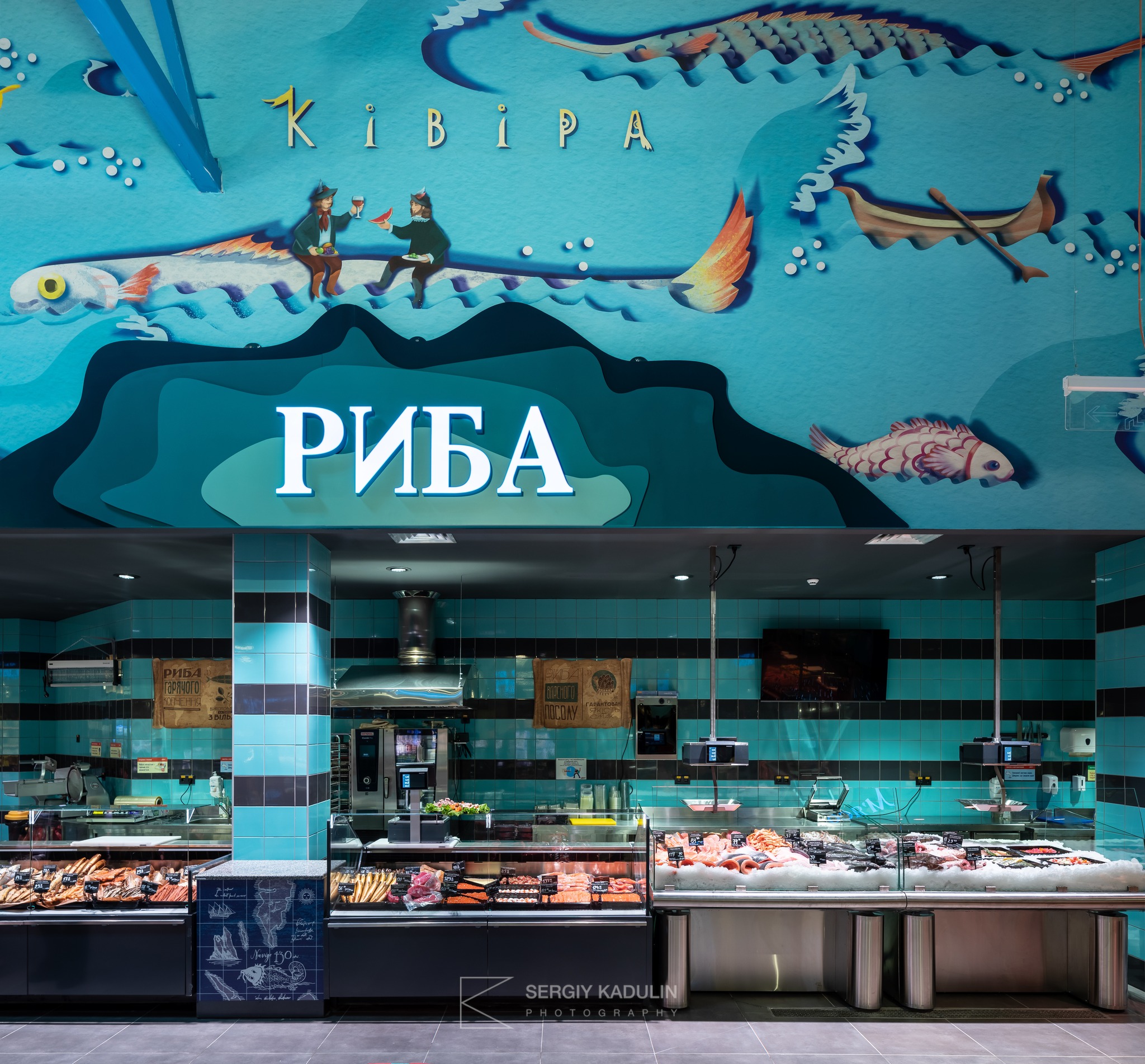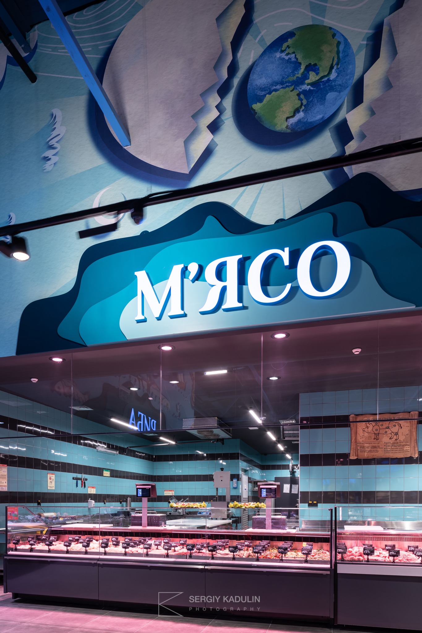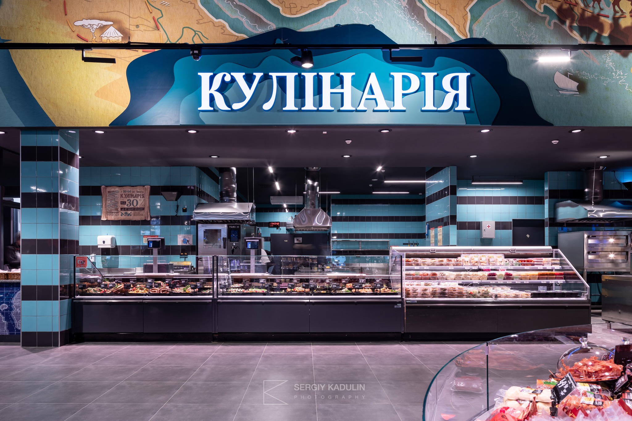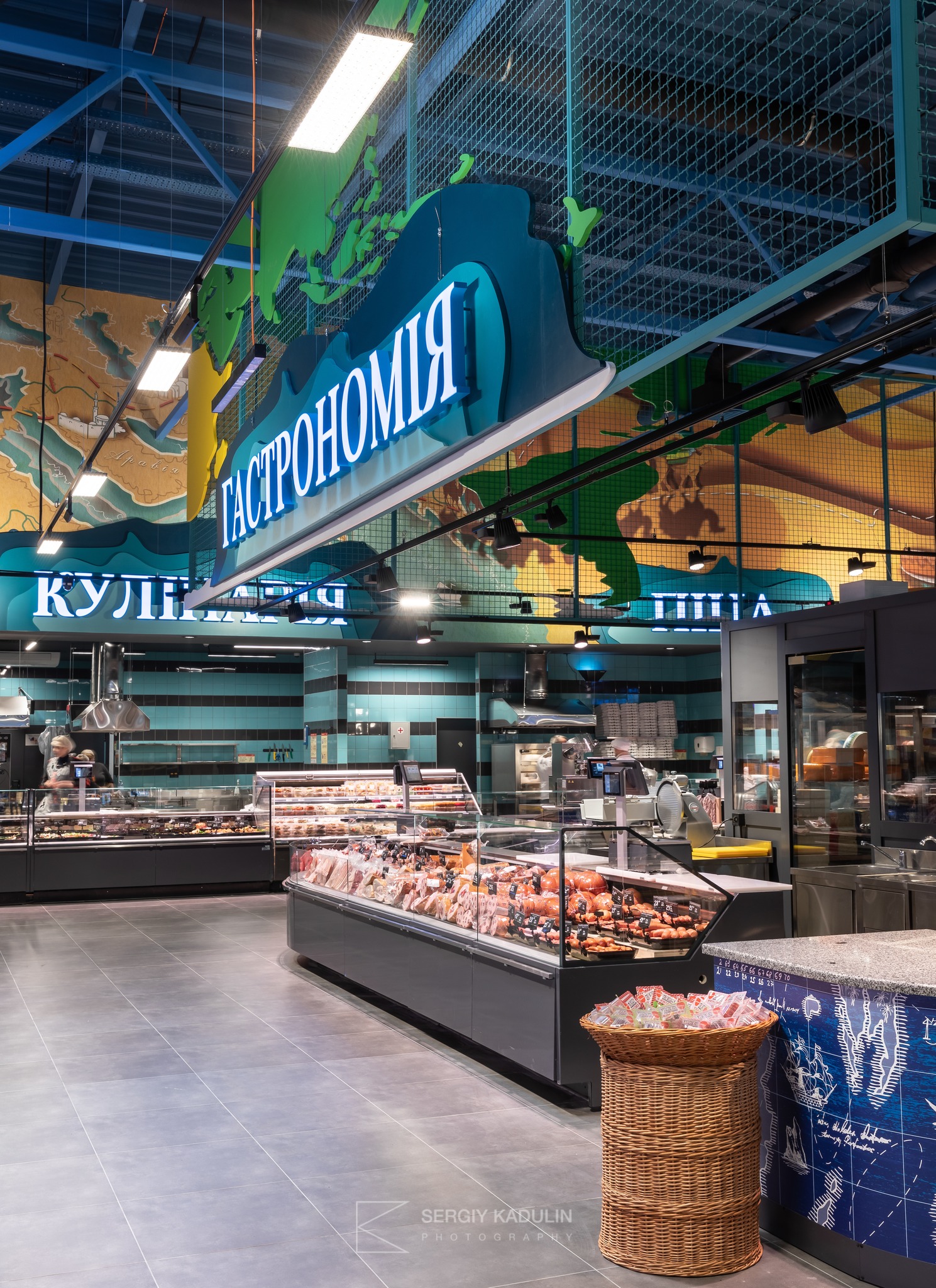 Всередині супермаркету можна зустріти ілюстрації з географічними картами, історіями великих мореплавців та їх подорожами. Вивіски відділів нагадують про багатошаровість нашої планети, як в історичному, так і у фізичному плані.