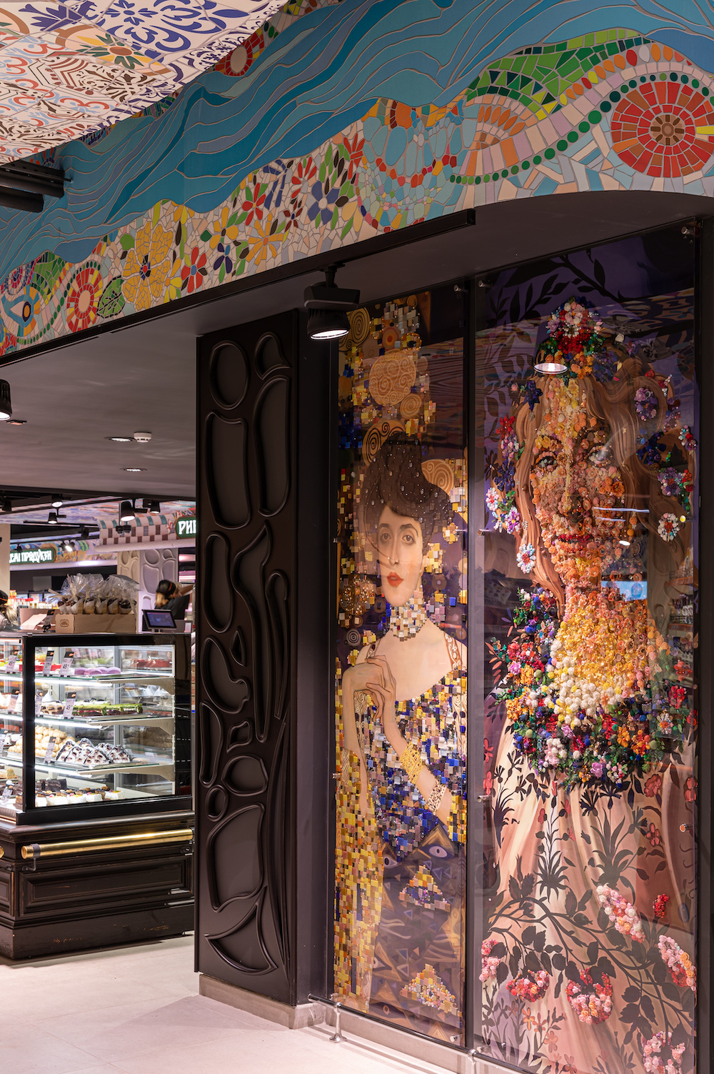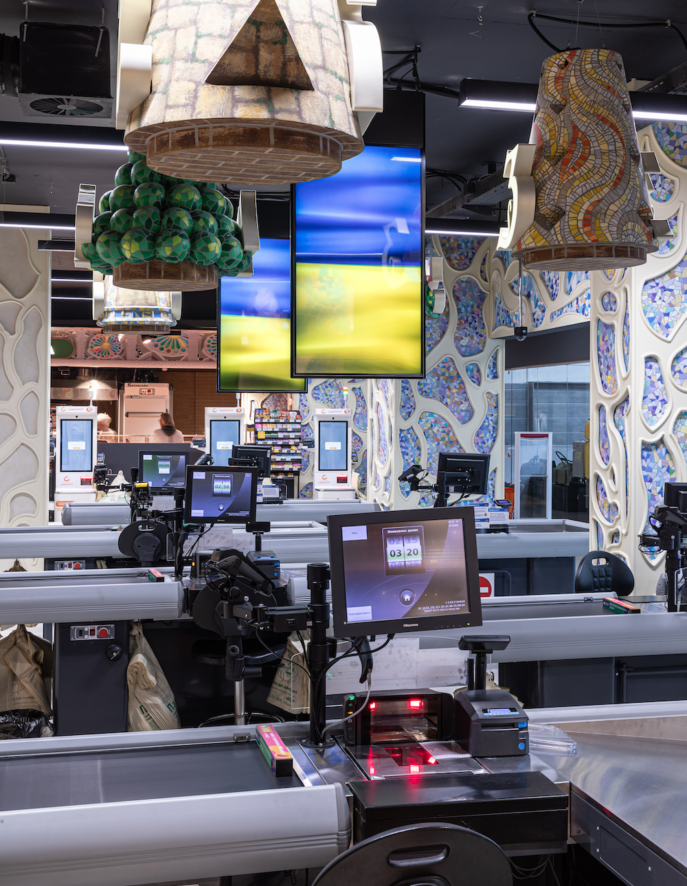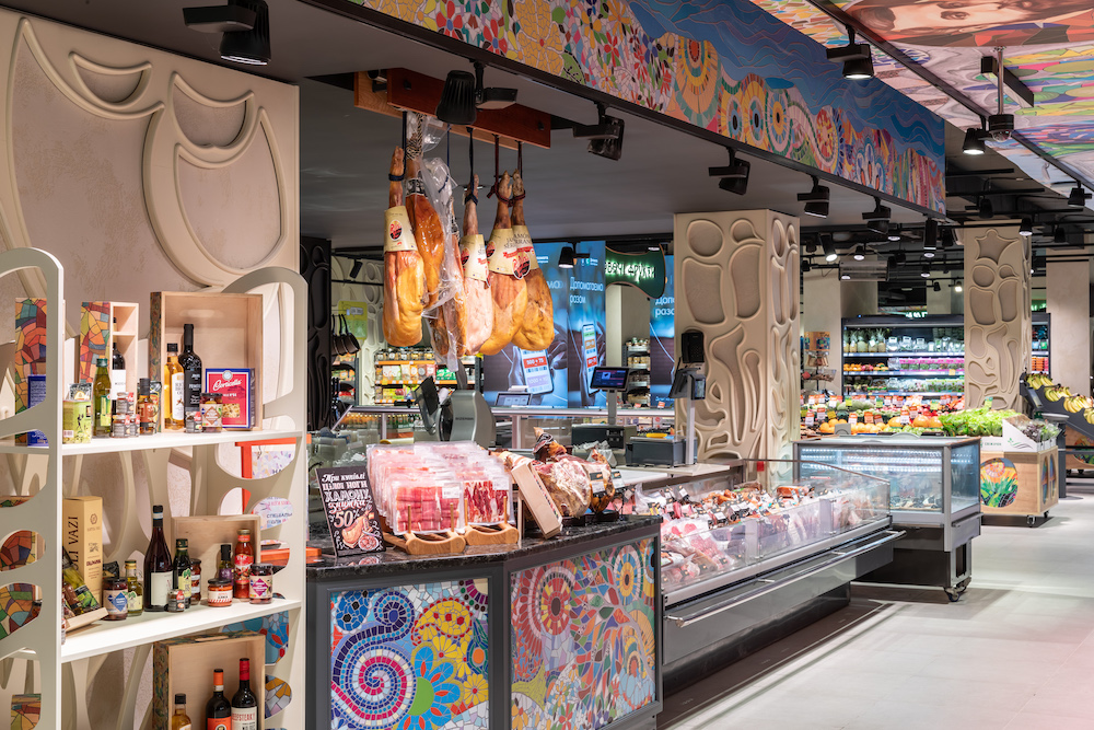 Мозаїка в магазині зустрічається не лише на стінах, а й на полицях. Її утворюють яскраві ряди соковитих овочів та фруктів. Візерунки зі свіжої, соленої й копченої рибки. Розмаїття страв з відділу кулінарії. Чудернацькі форми багетиків та округлі форми піци власного виробництва – все, як любив Гауді, без гострих кутів. Та все інше, що є невід’ємною частиною Сільпо.