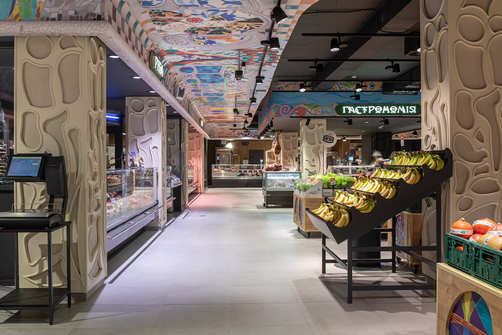 Основою інтер’єру супермаркету є мозаїка та плавність ліній. Оскільки рішення Гауді майже не мають прямих ліній та гострих кутів, фрізи у магазині мають округлі та непередбачувані форми. Вони беруть початок зі стелі та перетікають в іншу площину.