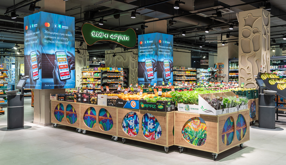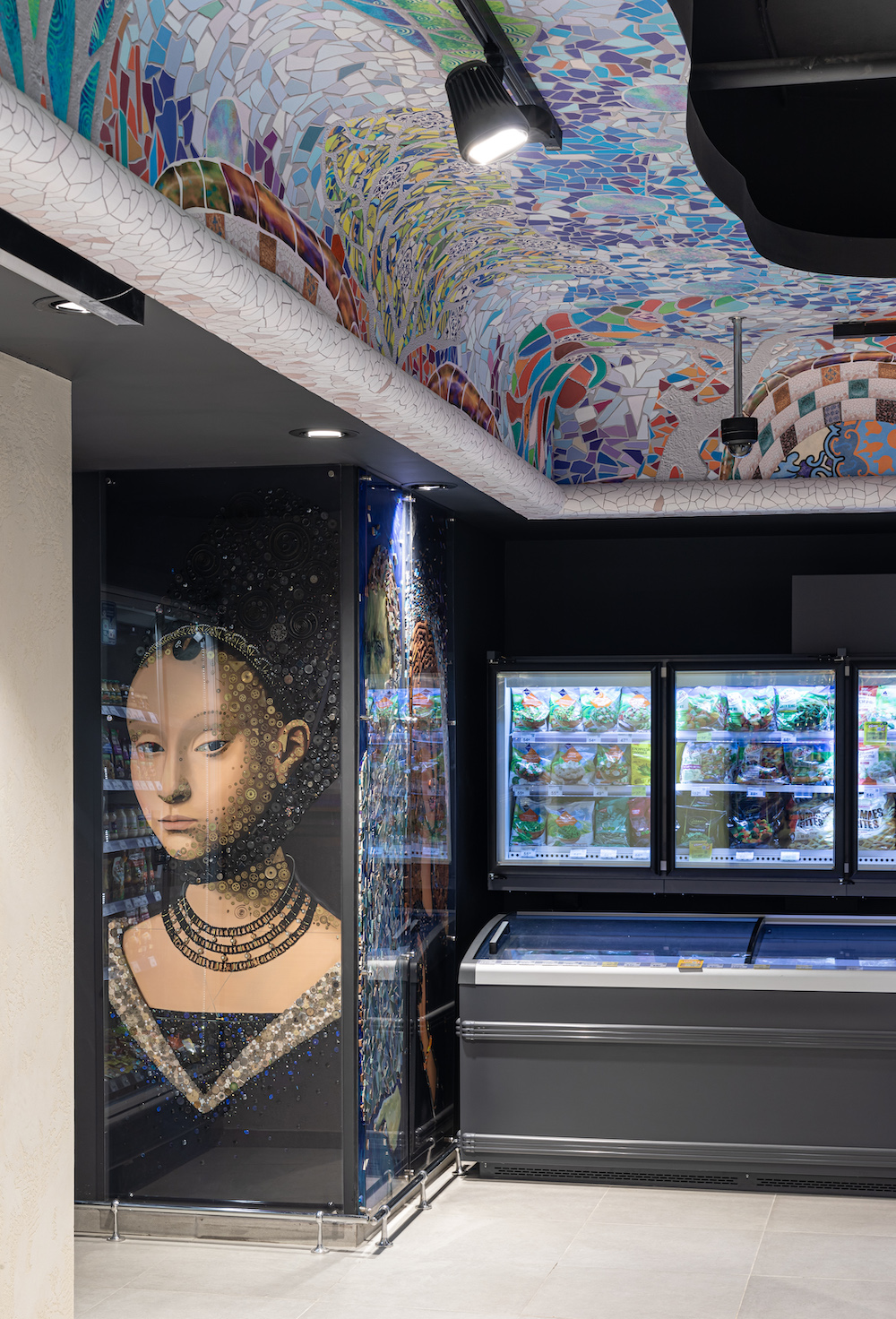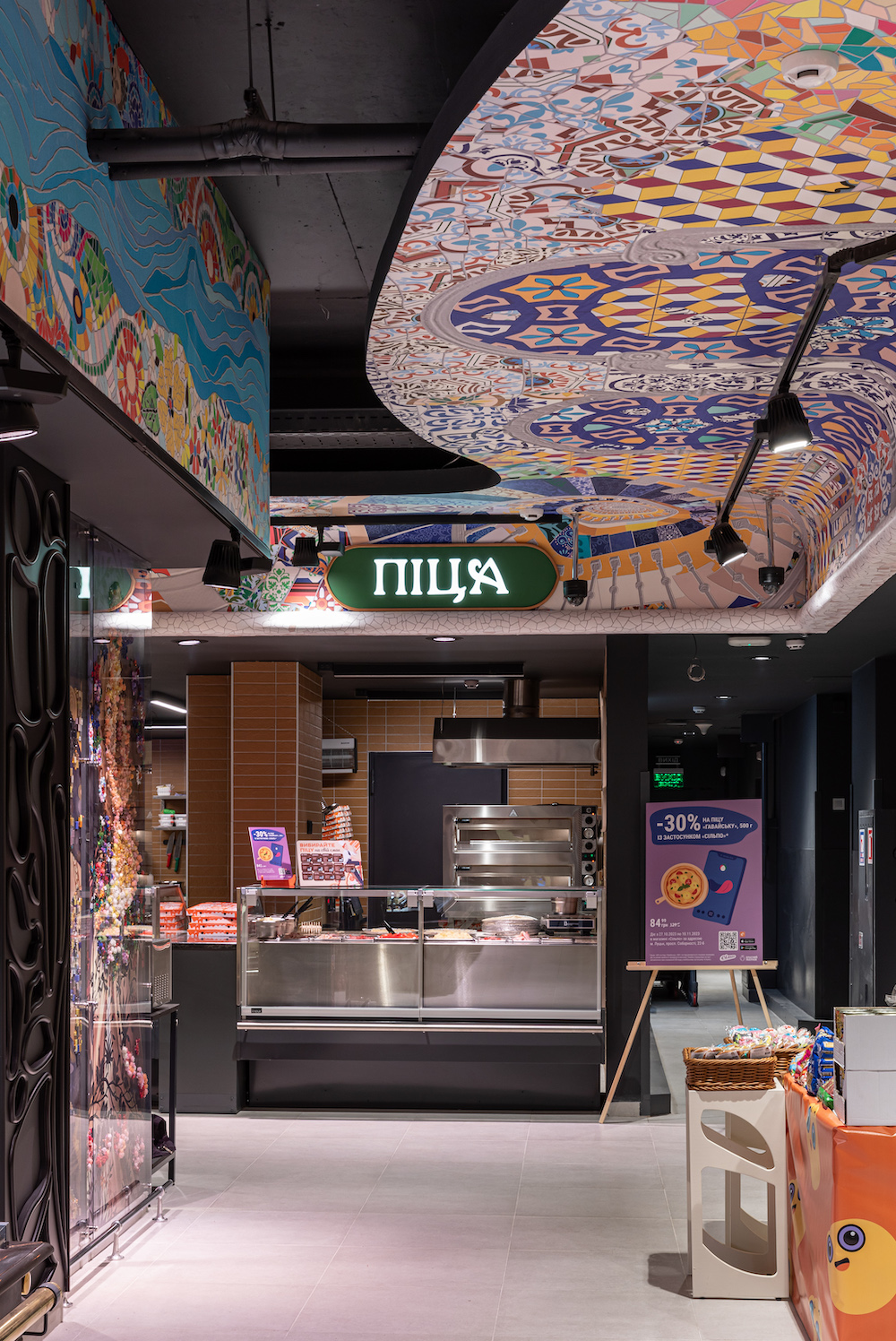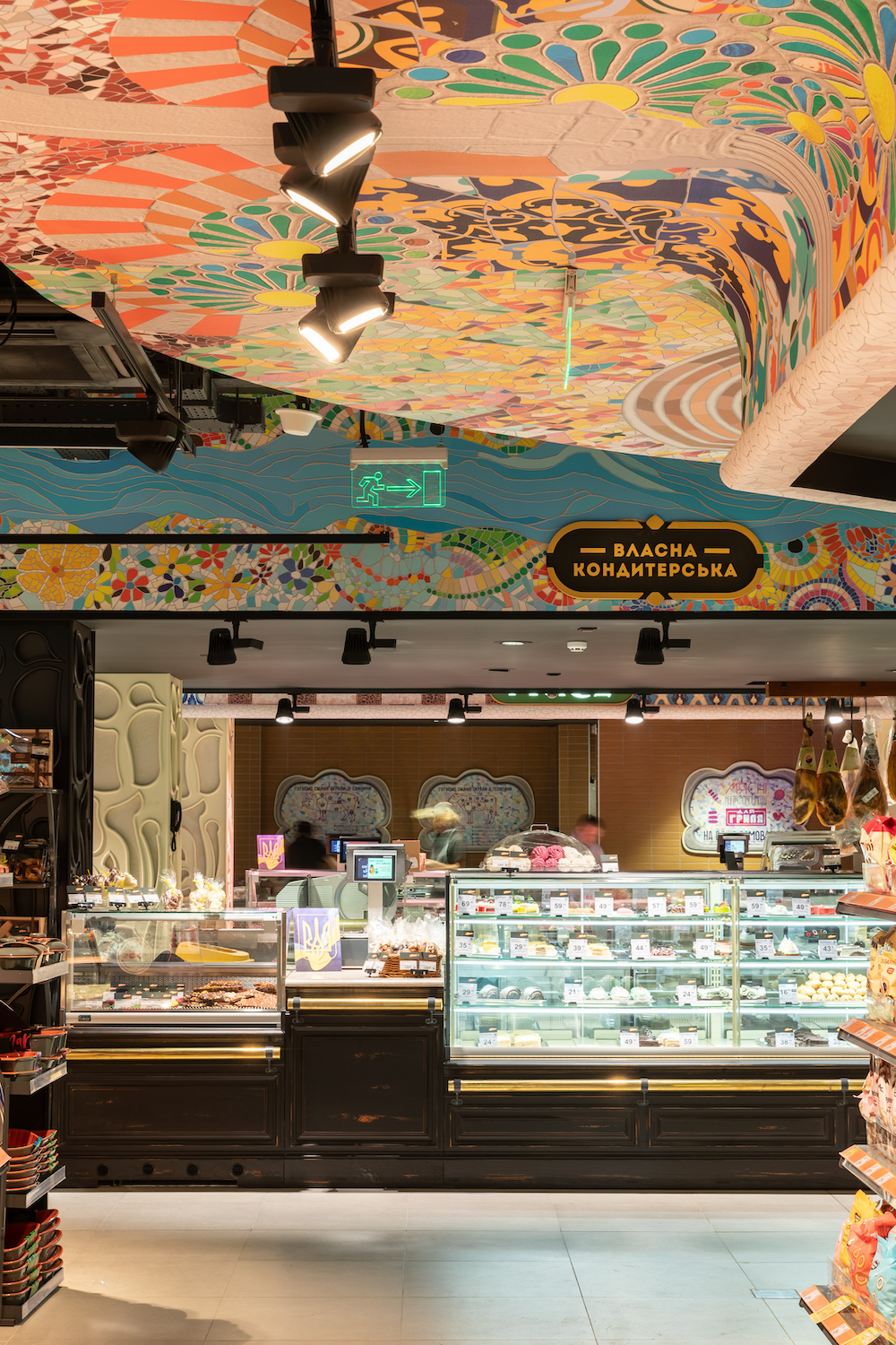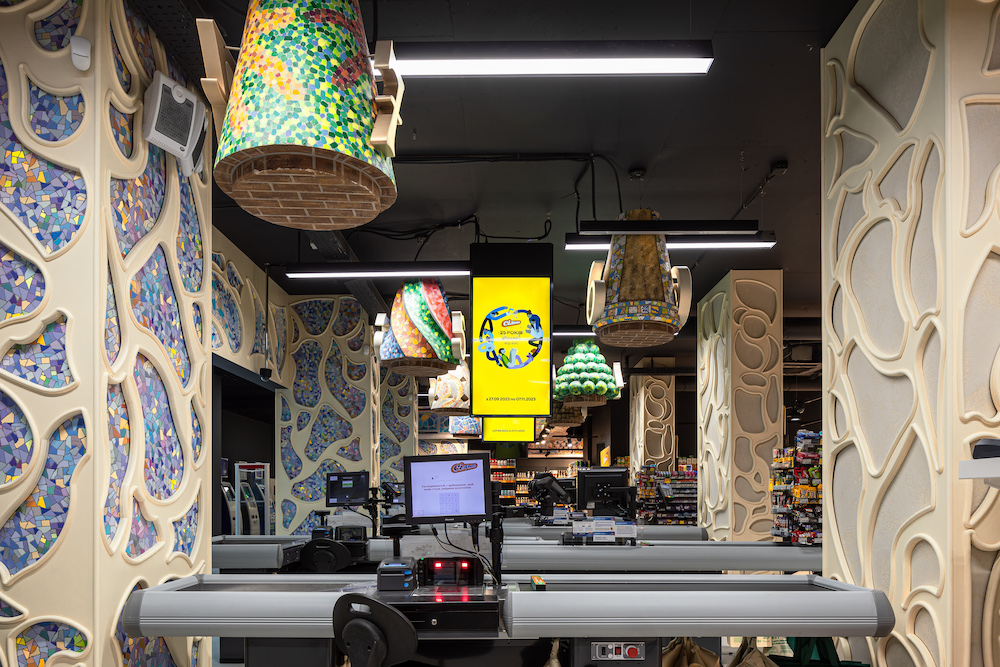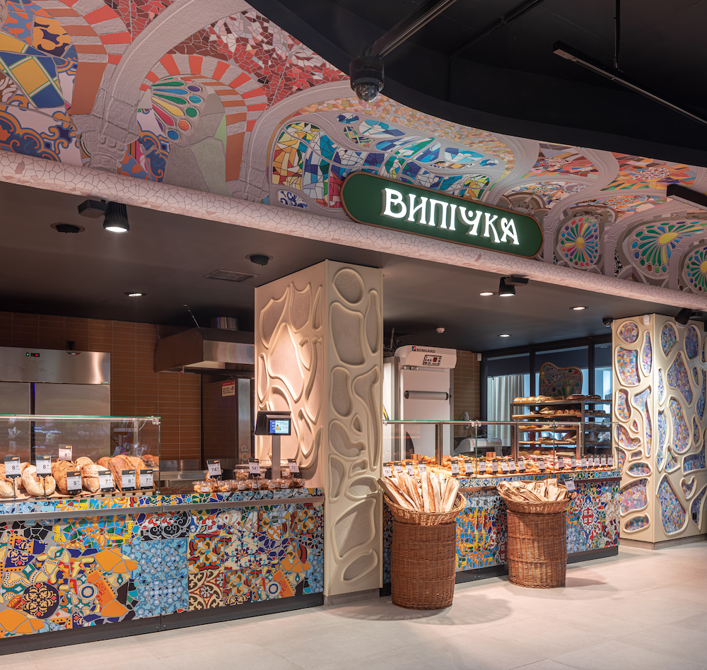 Мозаїка в магазині зустрічається не лише на стінах, а й на полицях. Її утворюють яскраві ряди соковитих овочів та фруктів. Візерунки зі свіжої, соленої й копченої рибки. Розмаїття страв з відділу кулінарії. Чудернацькі форми багетиків та округлі форми піци власного виробництва – все, як любив Гауді, без гострих кутів. Та все інше, що є невід’ємною частиною Сільпо.