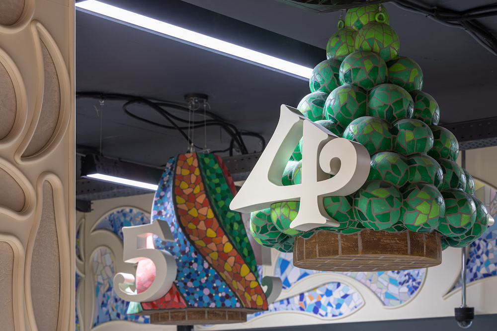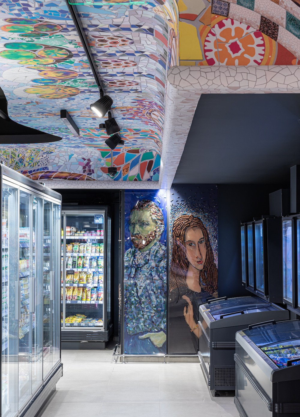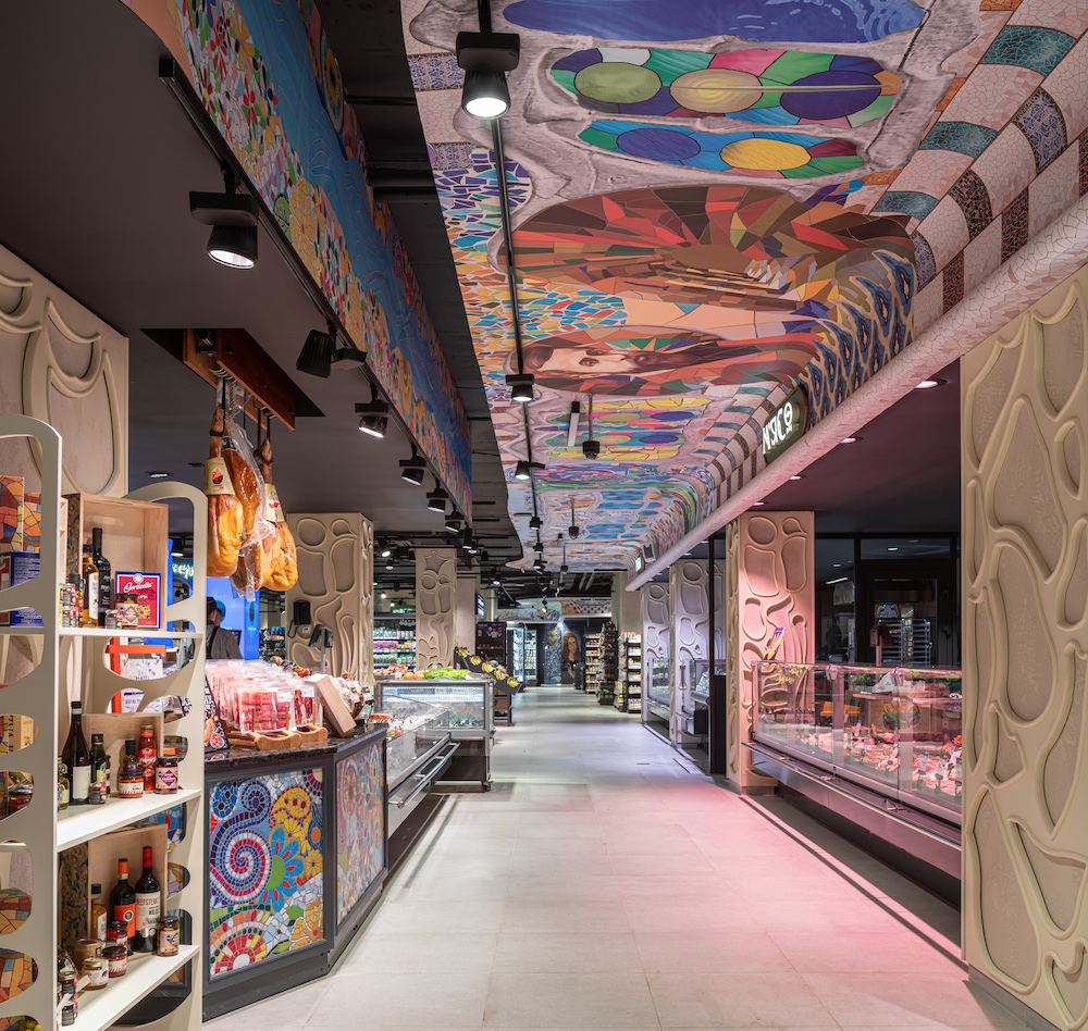 Основою інтер’єру супермаркету є мозаїка та плавність ліній. Оскільки рішення Гауді майже не мають прямих ліній та гострих кутів, фрізи у магазині мають округлі та непередбачувані форми. Вони беруть початок зі стелі та перетікають в іншу площину.