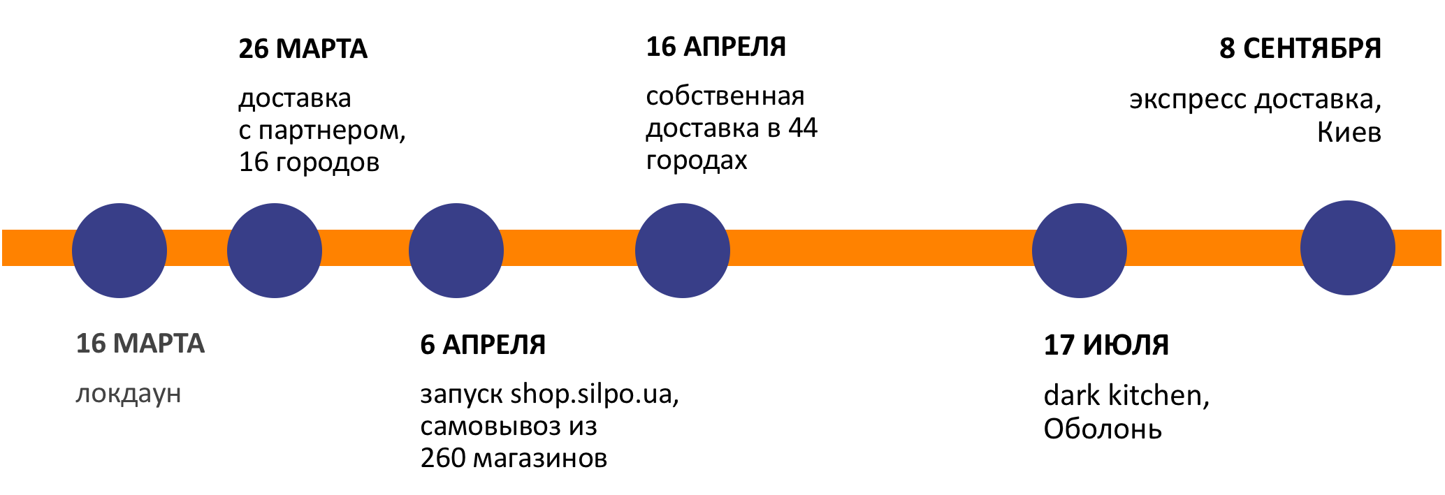 Коли в середині березня стало зрозуміло, що буде локдаун, перед нами стояло завдання надати гостям у всіх містах присутності Сільпо можливість замовляти продукти онлайн. Протягом двох тижнів нам потрібно було запустити онлайн-магазин і послугу самовивозу продуктів у всіх магазинах мережі (на той момент їх було 260). Так, 26 березня ми запропонували доставку продуктів з сервісом Glovo в 16-ти містах; 6 квітня – у нас запрацював інтернет-магазин shop.silpo.ua, і з’явилася послуга самовивозу; 16 квітня в 44-х містах з’явився власний сервіс планової доставки з двогодинними слотами, а через 10 днів ми підключили до цієї послуги решту міст, де присутні супермаркети Сільпо.