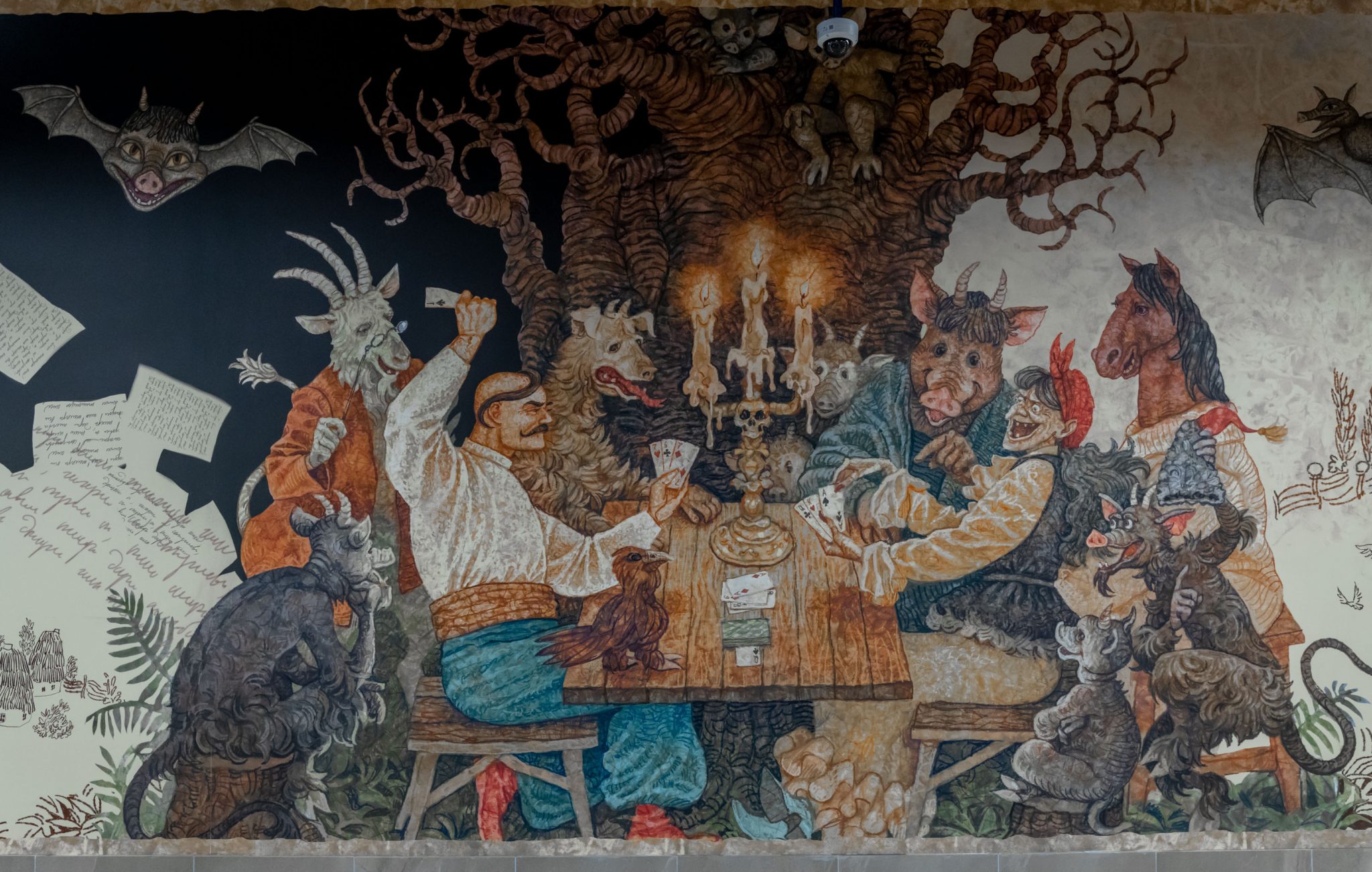 На одній зі стін зображена сцена, де відьми та інші чудовиська в пеклі, куди потрапив запорожець в «Пропала грамота», грають в карти.