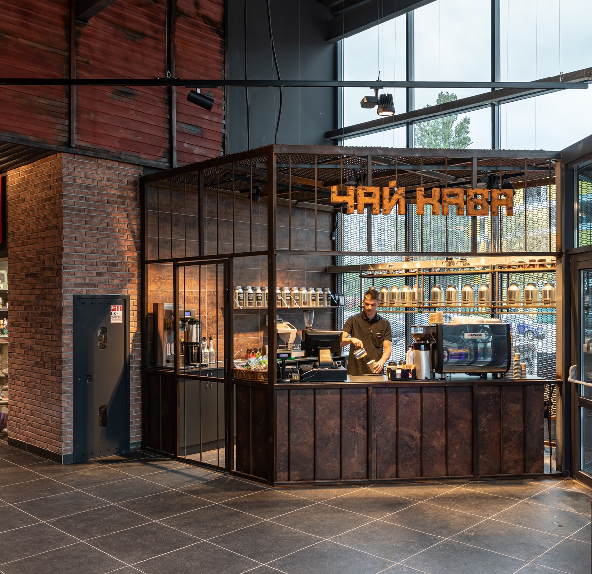Кавовий бутик при вході оформлений як бункер Сидоровича. Тут є кава, яку мережа самостійно імпортує і обсмажує на власному заводі у Ворзелі.