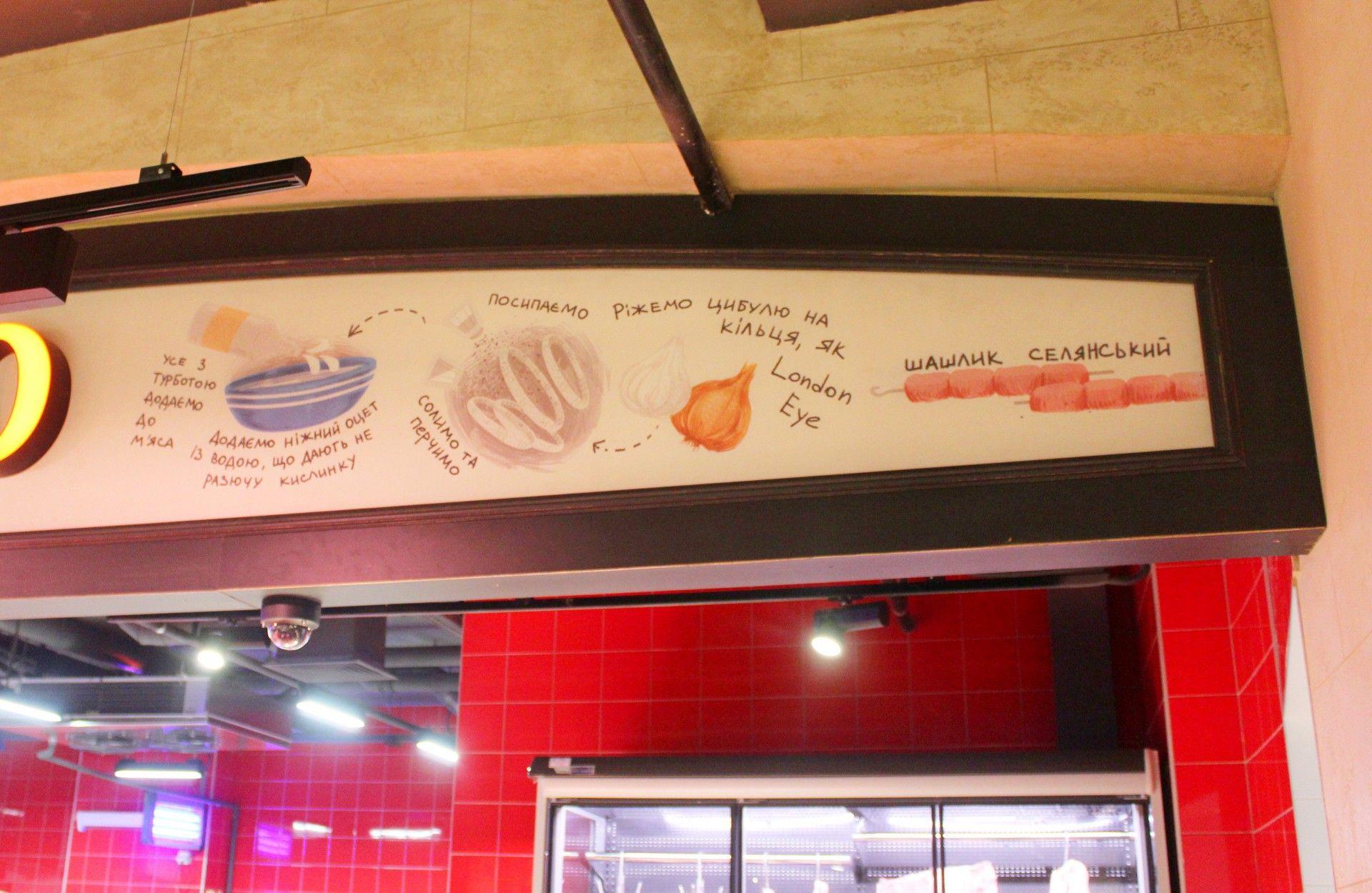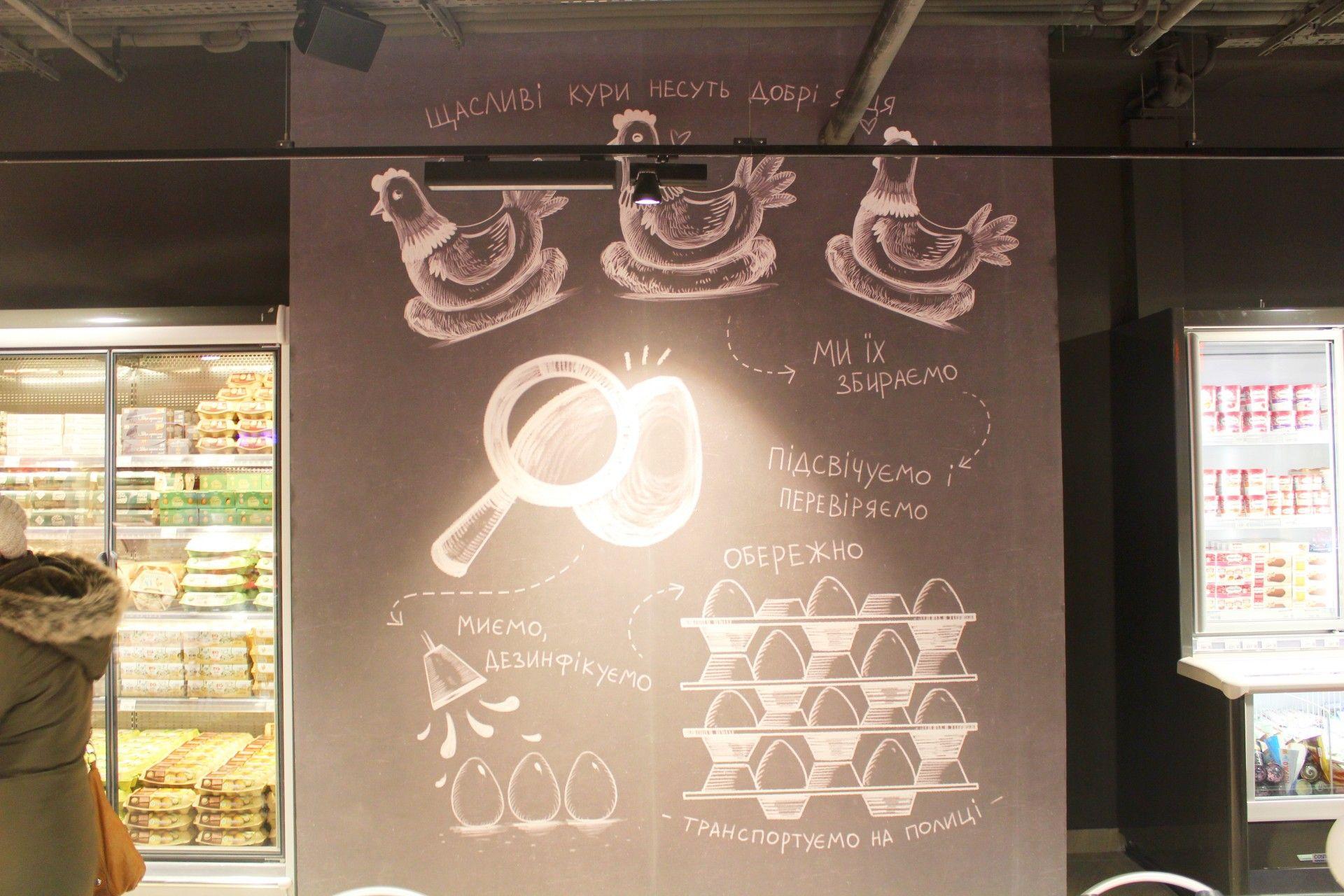 На одній зі схем можна знайти твердження, що “щасливі кури несуть добрі яйця”. Трохи нижче художники Сільпо зобразили їх подальшу долю: яйця збирають, підсвічують, перевіряють, дезінфікують і обережно транспортують на полиці з товаром. З іншої схеми можна дізнатися, що в м’ясо для шашлику додають оцет з водою, які надають йому “не разючу кислинку”, солять, перчать, ріжуть цибулю на кільця, як London Eye, і вуаля – виходить селянський шашлик.