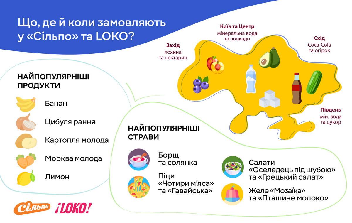 Щодо регіональних особливостей, то в усіх областях найпопулярніша страва — борщ, а ось найулюбленішим продуктом є банани. У Києві високий попит на мінеральну воду та авокадо, а на півдні — на цукор. На заході більш популярні ягоди, зокрема лохина та нектарини. На сході активно замовляють воду Coca-Cola та огірки. Також помітні відмінності в уподобаннях до супів: холодник має велику популярність на сході, тоді як в інших областях його замовляють значно менше.
