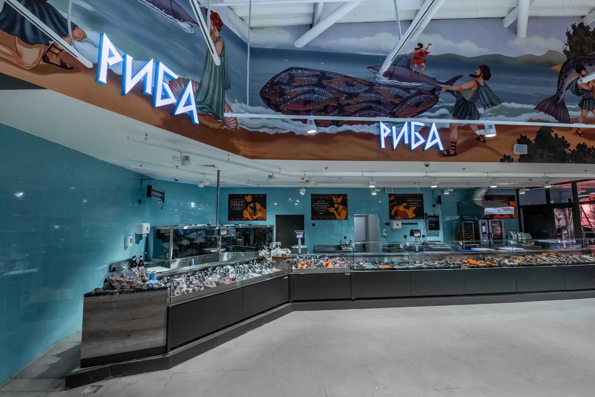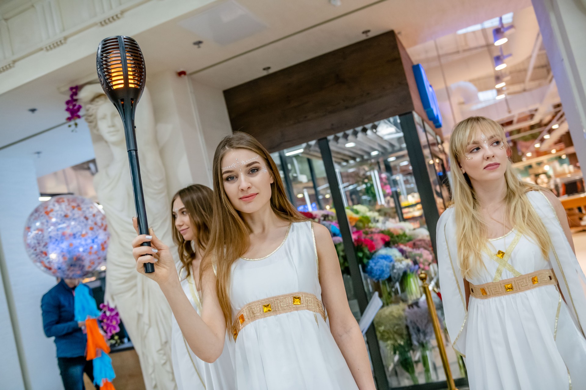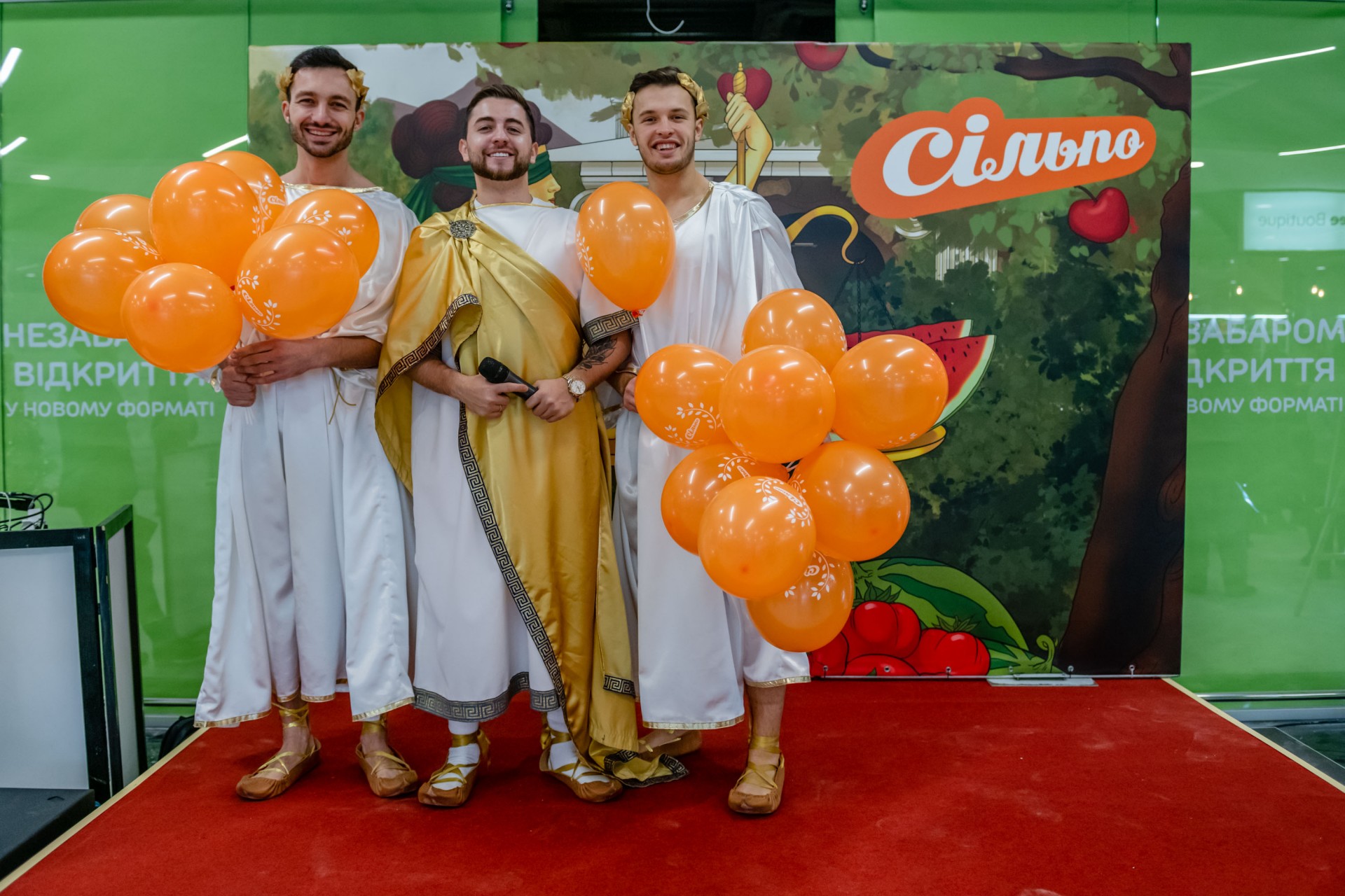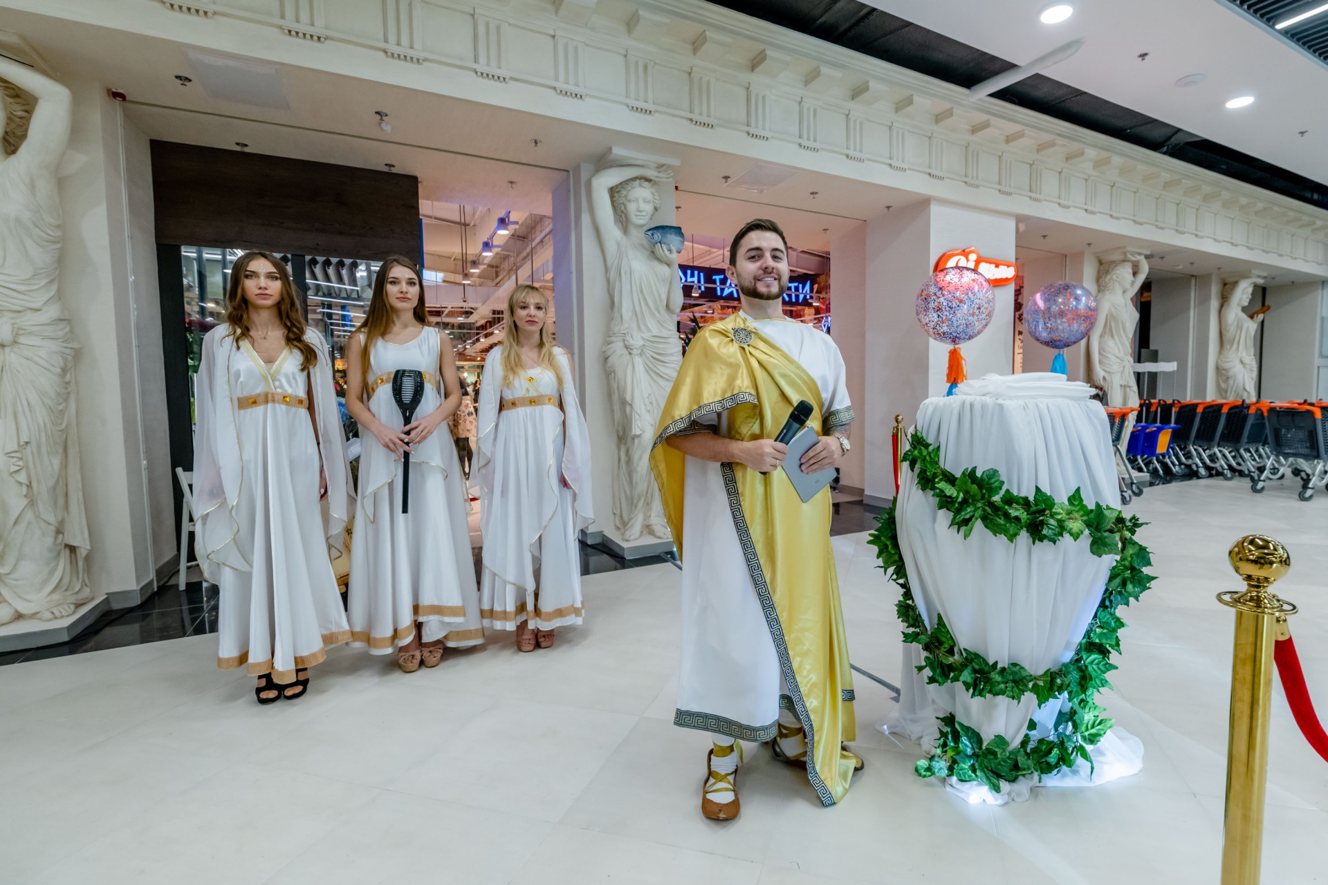 Стіни магазину розписані сюжетами з античної міфології. Доповнюють інтер’єр статуї ручної роботи. Для бажаючих зробити незвичайне селфі або фото з однією з “афродіт” встановили фотозону “Олімп” з логотипом Сільпо і капітелями в грецькому стилі.