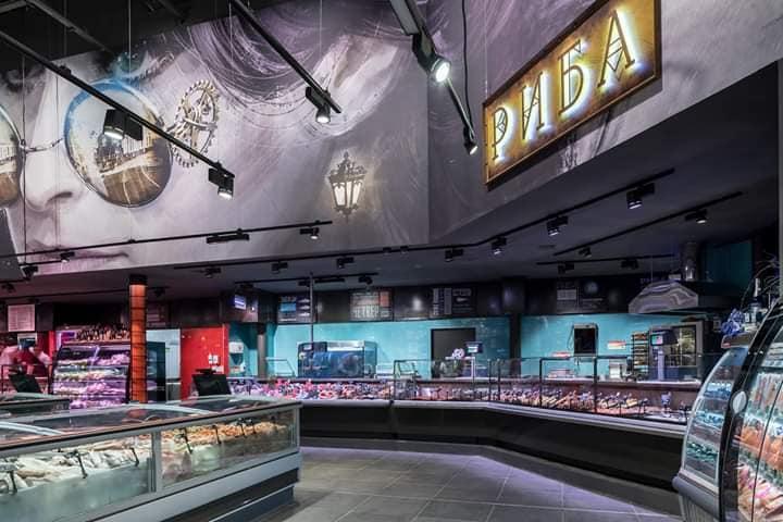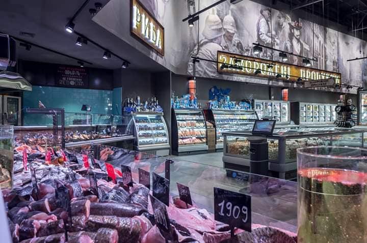 Рибний відділ, оформлений підсвіткою синіх відтінків, вписується в концепцію супермаркету.