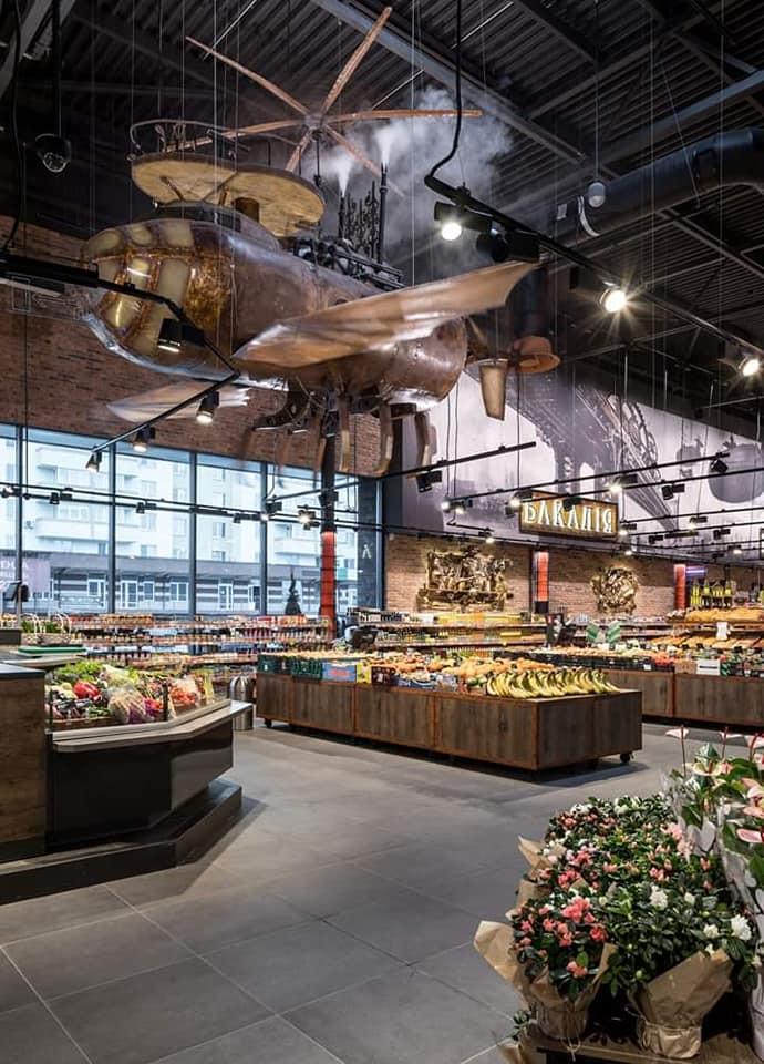 Атмосферне освітлення, з акцентами на конкретних відділах і товарних группах, занурює у світ механізмів, що переміщуються у просторі завдяки паровому двигуну, неважливо, чи то небо, чи тверда земля.