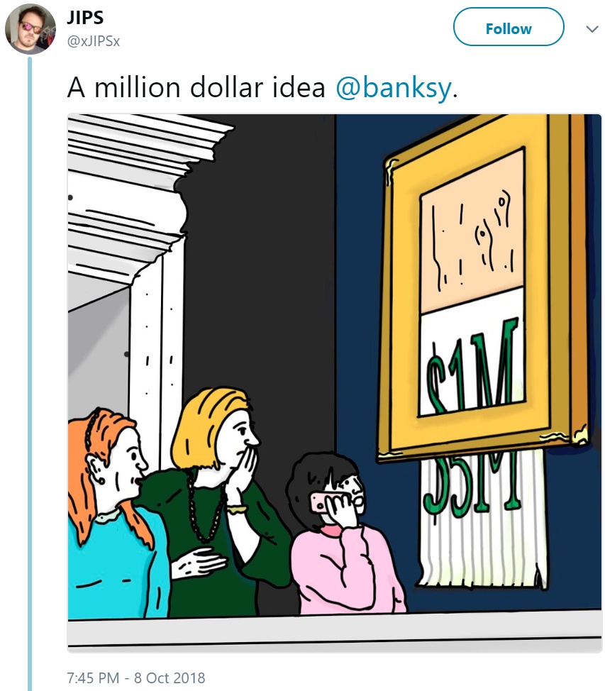 Несподіване самознищення картини Бенксі під час аукціону Sotheby’s 5 жовтня змусило обговорювати мистецтво навіть тих, кому, як правило, живопис і тим більше андеграундні художники стріт-арту байдужі. Публічний акт грандіозного вандалізму вартістю 1,04 мільйона фунтів стерлінгів раптово надихнув соцмережі на різні карикатури і жарти, увічнивши тим самим картину Бенксі «Дівчина з повітряною кулею» ще й у такому типі хуліганського мистецтва, як меми. До фотошоп-веселощів приєдналися також українські та світові бренди. Для тих, хто пропустив, можна подивитися відео, як це було, ну і після нього поїхали!