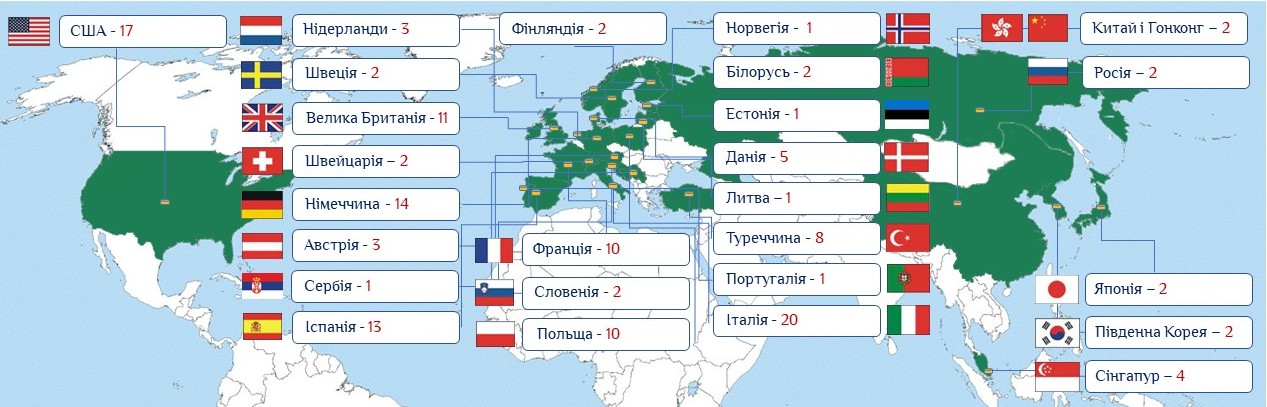 Приблизно три чверті іноземних брендів в Україні – європейські марки. Найбільш масово представлені Італія (20 брендів), Іспанія та Німеччина (по 13 і 14 брендів відповідно). Однак на другому місці після Італії за кількістю торгових марок знаходяться американські компанії – цілих 17. По десятку брендів – з Франції, Польщі та Великобританії.
