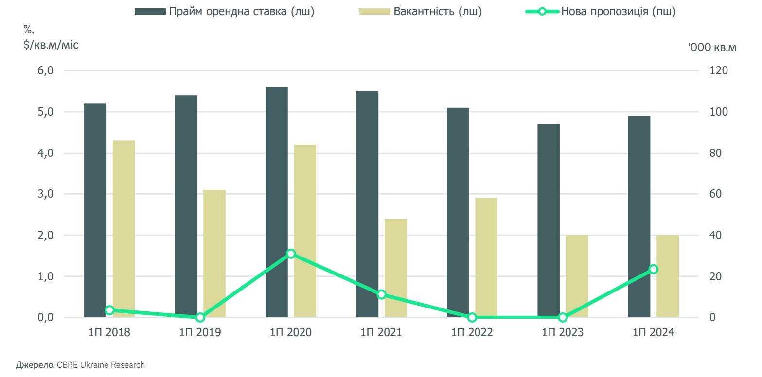 У 2024 році було введено першу чергу логістичного комплексу Дударків (23 400 кв. м), половина площ якого вже попередньо орендована. Це сприяло збільшенню обсягу складських площ на ринку на 1,8% з початку року. Відповідно станом на початок липня 2024 року загальна пропозиція в столичному регіоні склала 1,32 млн кв. м якісних складів. Зважаючи на обмежену нову пропозицію та постійний дефіцит вільних площ, рівень вакантності залишався стабільним на рівні 2%, що відповідає довоєнним показникам. Аналітики прогнозують подальше збереження вакантності на цьому рівні. Перш за все завдяки активному поглинанню, коли будь-які приміщення, що звільняються в результаті переїзду бізнесу або скорочення його потреб, швидко поглинаються іншими орендарями, не встигаючи навіть вийти на відкритий ринок.