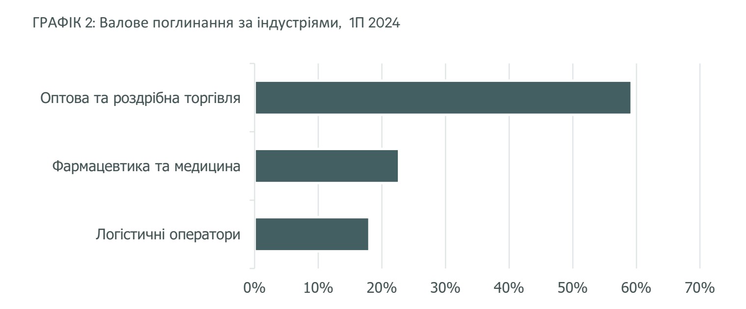 Як і раніше, в структурі валового поглинання домінував сектор оптової та роздрібної торгівлі (59%), за ним слідує сектор фармацевтики та медицини (23%), що продемонстрував зростання майже на 17% з початку року. Водночас частка логістичних та 3PL операторів (18%) продовжувала знижуватися, скоротившись приблизно удвічі, порівняно з аналогічним періодом 2023 року.