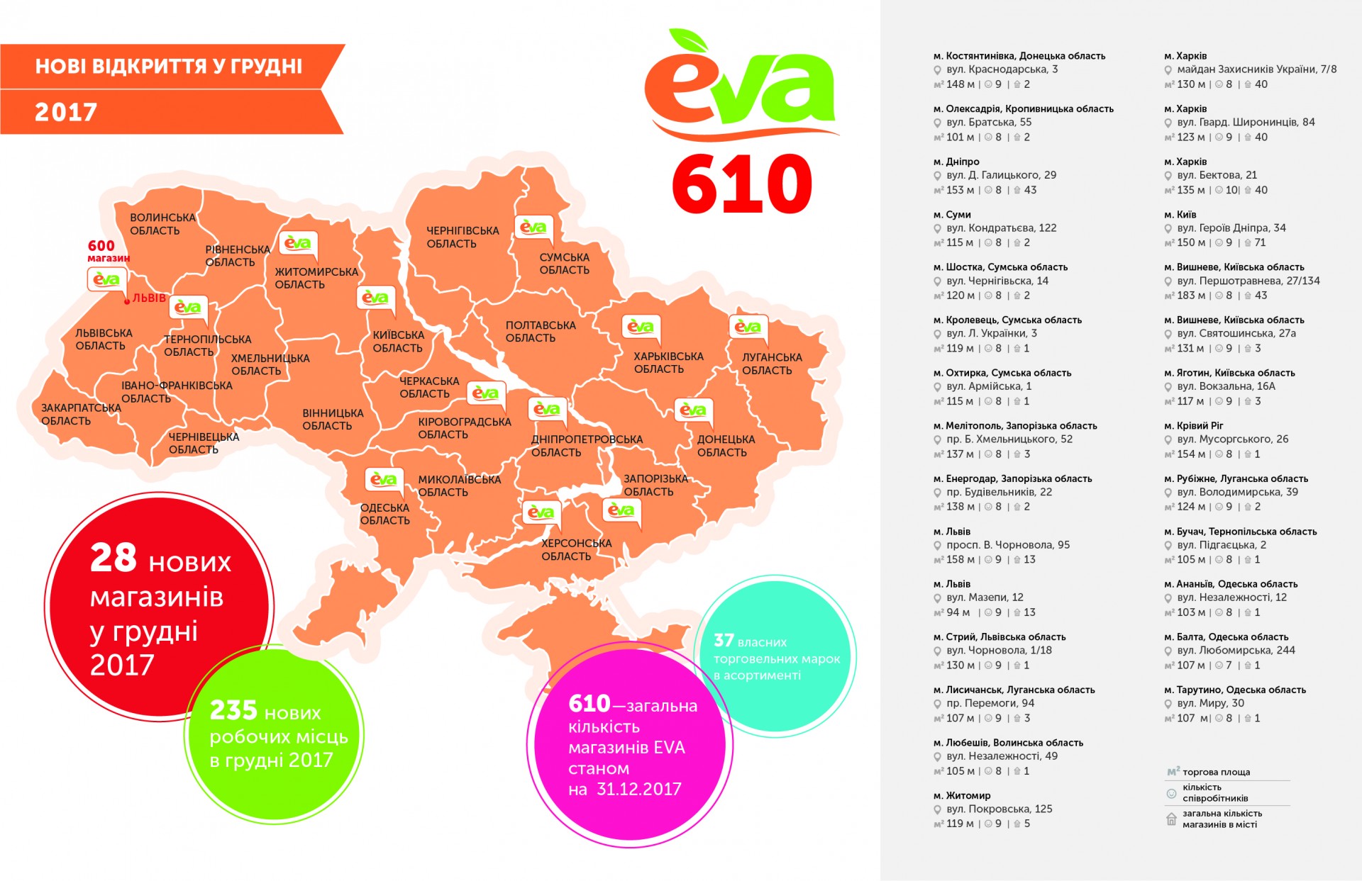 Лінія Магазинів EVA за підсумками минулого року стала безумовним лідером з відкриття торгових точок в сегменті drogerie. Компанія розширила мережу на 154 магазини і до кінця року об’єднувала 610 торгових об’єктів. Тепер магазини мережі представлені у всіх регіонах України, а їх загальна площа становить більше 88 000 кв. м. Крім цього, в 2017-м EVA відкрила власний інтернет-магазин.