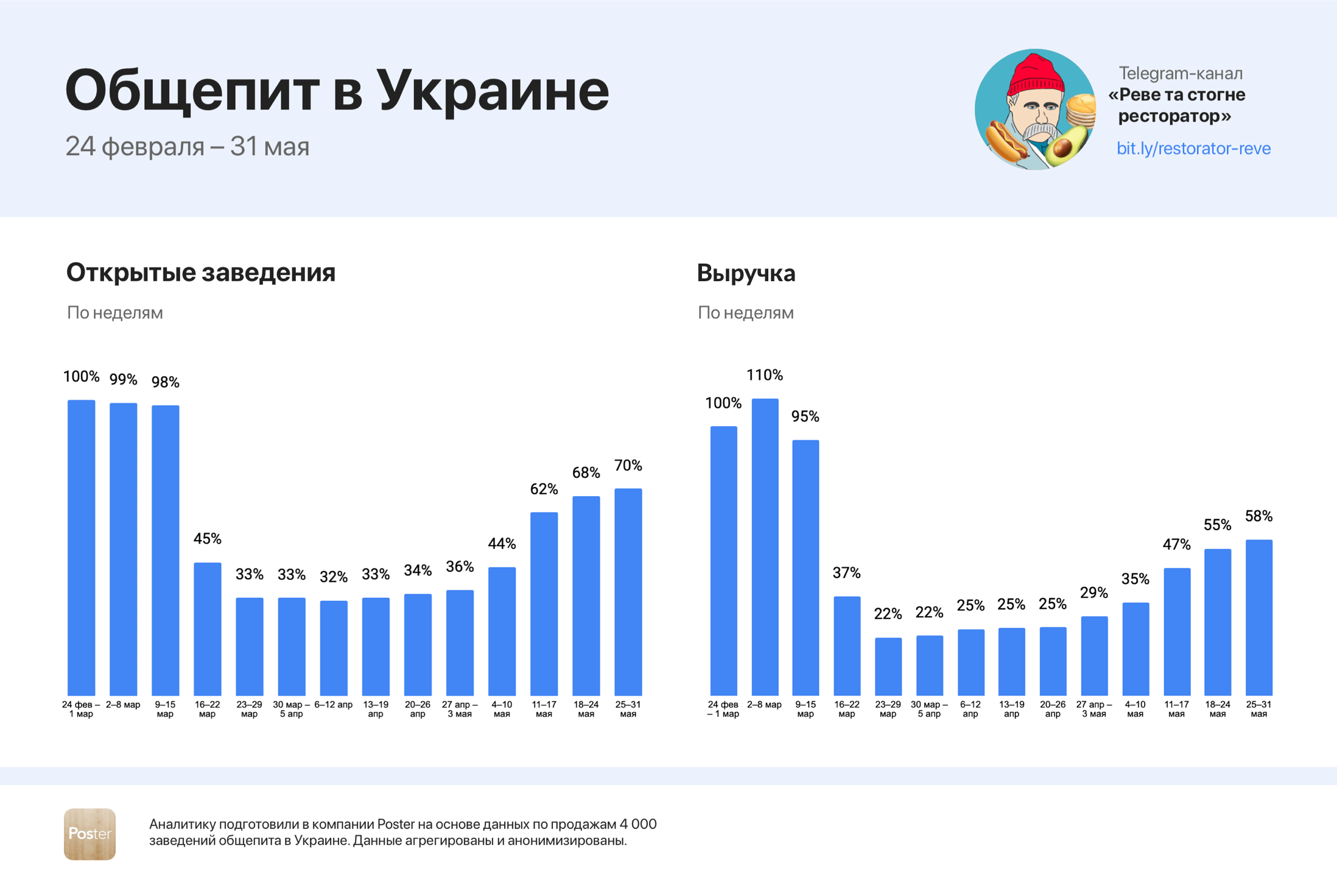 Про це свідчать результати дослідження компанії з автоматизації кафе, ресторанів і магазинів Poster, опубліковані в Telegram-каналі «Реве та стогне ресторатор». Дослідження базується на неперсоналізованих даних про продажі 4000 закладів громадського харчування України і взяті за період з лютого по травень 2020 року.